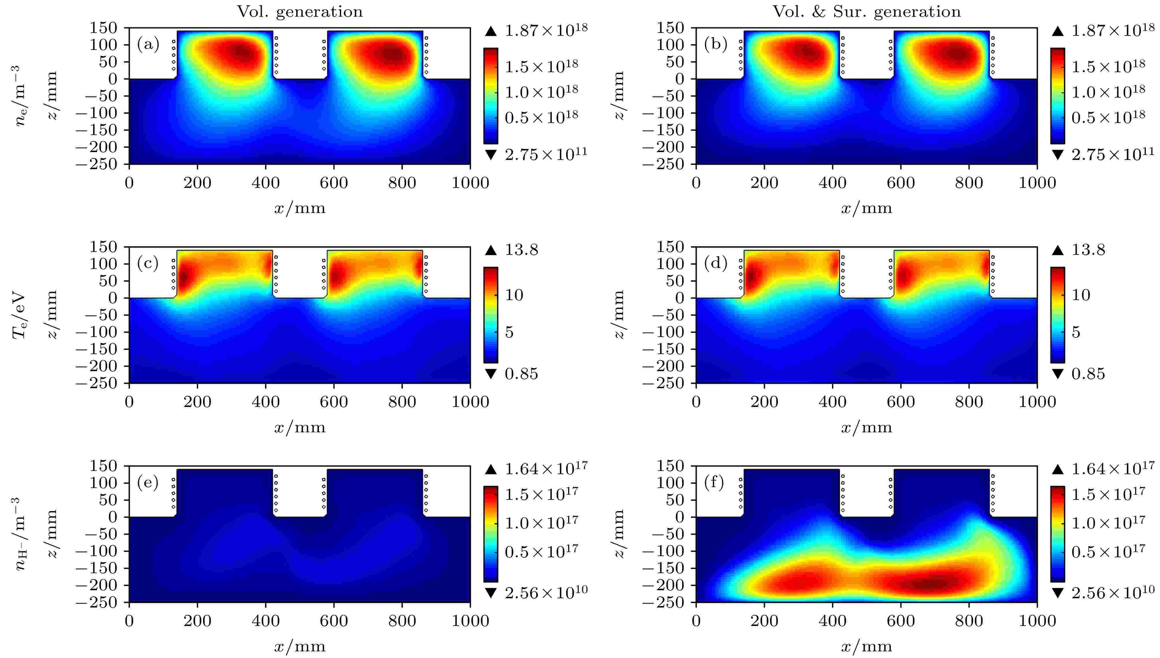 中性束注入是托卡马克装置中加热等离子体的主流辅助手段. 射频负氢离子源作为中性束注入系统的关键前端部件, 其性能直接影响中性束的质量. 目前, 提升负氢离子源性能仍是亟待深入研究的课题. 为此, 本文针对双驱动负氢离子源, 建立了一个三维流体模型, 用于模拟和优化表面产生机制下的负离子密度分布. 首先, 对比分析了体产生与表面产生两种机制下的等离子体参数, 结果表明表面产生机制获得的负离子密度比体产生机制高出1个数量级. 然而, 受过滤磁场影响, 引出区附近的负离子密度分布呈现不对称性. 为改善该不对称性, 在表面产生机制的基础上, 提出了两种优化方案: 1)在低密度侧增加射频源功率; 2)在扩散区引入隔板结构. 模拟结果显示, 两种方案均显著改善了负离子密度分布的对称性. 最后还提出了在扩散区背板添加磁屏蔽的方式来进一步优化负氢离子密度数值, 可以将扩散区下游的负离子密度提高69%.