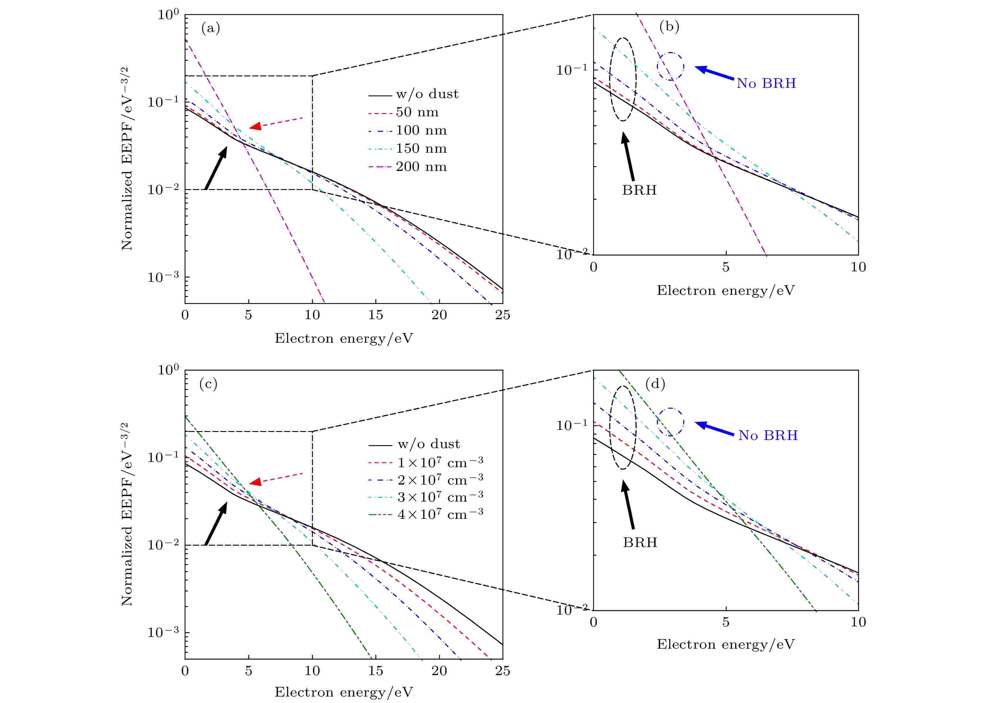 低气压射频感性放电可以产生更均匀的单分散颗粒和等离子体, 因此常被用于纳米器件制造中. 纳米器件制造需要产生纳米到亚微米尺度的颗粒. 由于其通常带负电荷, 会显著影响等离子体的放电特性. 本文主要研究了尘埃颗粒的尺度和密度对低气压感性耦合等离子体中电子反弹共振加热效应以及基本等离子体性质的影响. 模拟结果表明, 随着颗粒半径或密度的增大, 在电子能量概率函数中以形成平台为特征的反弹共振加热效应逐渐受到抑制并最终消失, 导致电子温度下降、电子密度上升、颗粒表面电势增大, 而颗粒带电量随着颗粒密度的增大而减小, 随着颗粒半径的增大呈现非单调变化. 本研究指出, 由于颗粒存在引发的高能电子的损失可能会为低缺陷、单分散纳米颗粒的生长创造更有利的环境. 颗粒质量的提升对降低纳米器件中的陷阱密度以及增强其电学性能具有重要意义.