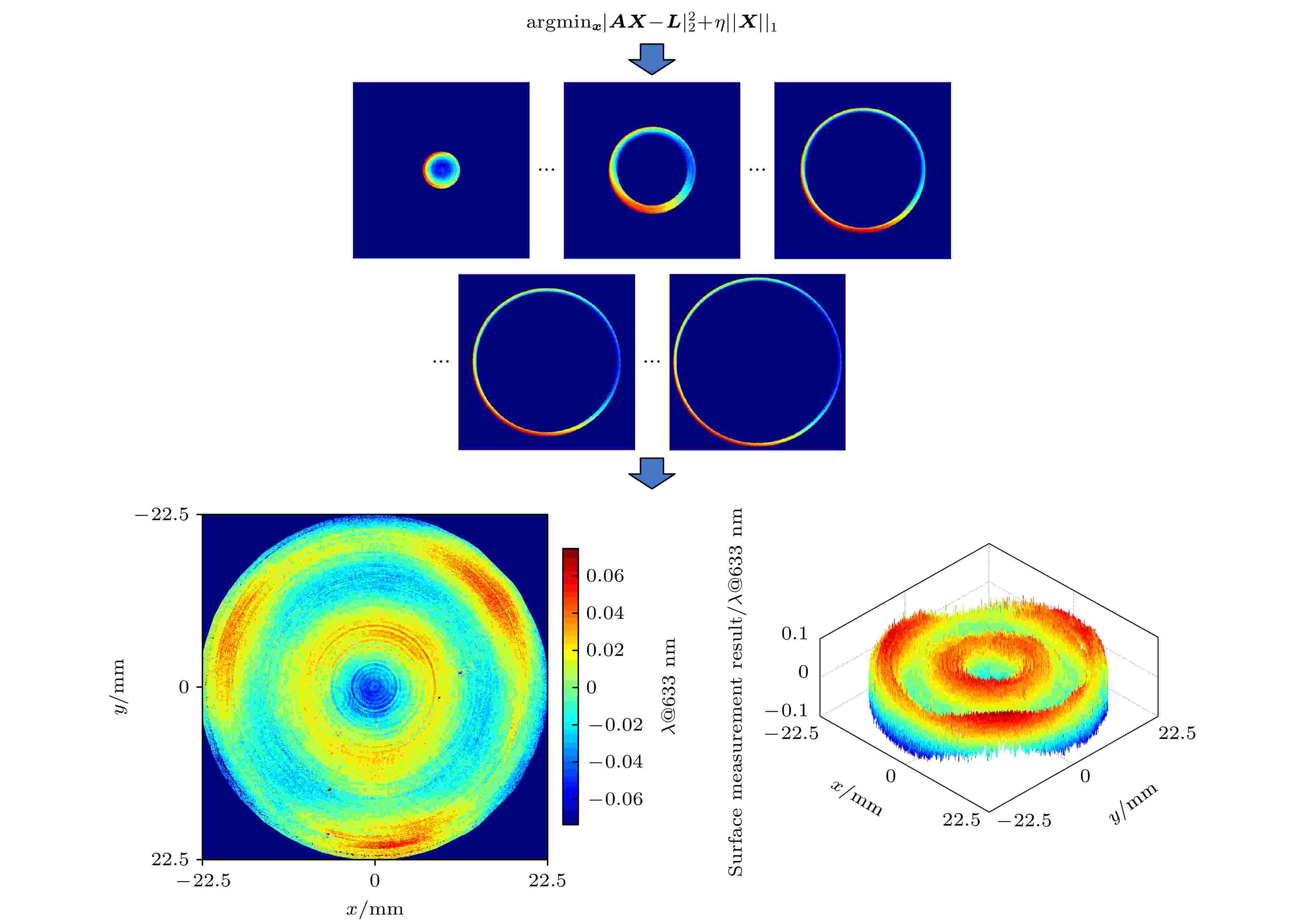 非球面光学元件在芯片制造、遥感探测及航空航天等前沿领域具有重要应用价值, 因而对其加工和检测精度的要求不断提高. 非球面环形子孔径拼接测量技术是一种高精度、通用性强的有效检测技术, 但在大非球面度、大陡度元件检测中显著的面形特征与测量误差的耦合问题制约了其测量精度的提升. 本文提出一种基于全口径面形特征与局部测量误差全局优化拟合的非球面测量误差解耦合技术, 通过构建包含全口径圆形泽尼克多项式与子孔径环形泽尼克多项式的全局优化模型, 实现全口径面形特征与子孔径局部测量误差的同步拟合解算与解耦合并提升测量精度. 仿真与实验结果表明, 该技术可有效地分离面形特征与测量误差, 同时可避免传统拼接测量方法中面形参考基准存在误差和子孔径误差累积的问题, 在本文的实验中其PVr精度较传统方法可提升近30%. 此外, 该技术无需依赖子孔径重叠区域, 能够减少子孔径数量、提升测量效率. 此方法为大非球面度、大陡度光学元件的高精度测量提供了技术解决方案.