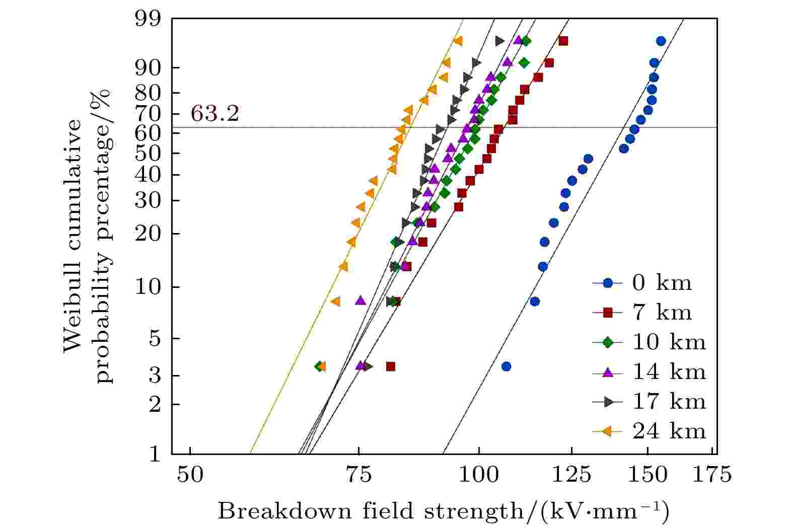 通过分子动力学模拟研究乙烯-四氟乙烯共聚物(ETFE)在低气压下的击穿性能, 并通过低气压击穿实验对仿真结果进行验证, 从原子尺度揭示ETFE材料在低气压下绝缘失效机制. 首先, 对ETFE进行分子动力学模拟, 随着飞行高度从0 km逐渐增大到24 km, 模拟气压从101.300 kPa逐渐降低到2.951 kPa, ETFE的分子间距离增大9.692%, 链间相互作用能降低8.383%, 自由体积分数增大62.586%, 而密度下降7.737%. 其次, 基于电机械击穿理论, 推导得到ETFE击穿场强降低17.626%. 最后, 通过低气压击穿实验测得击穿场强下降40.078%, 密度测试得到密度下降1.574%. 仿真和实验结果均证明, ETFE的击穿场强随着气压的下降而降低. 这是由于处于低气压条件时, 自由体积分数的增加与密度的降低均为自由电子提供更长的自由行程; 而电荷陷阱能级的下降导致介质对电荷的束缚能力下降, 使自由电子浓度增加. 以上因素的共同作用导致ETFE在不同飞行高度下的击穿场强下降, 为ETFE在航空航天、高飞行高度极端环境下的应用提供了性能预测与失效机理分析, 对航空绝缘ETFE材料的优化设计具有指导意义.
