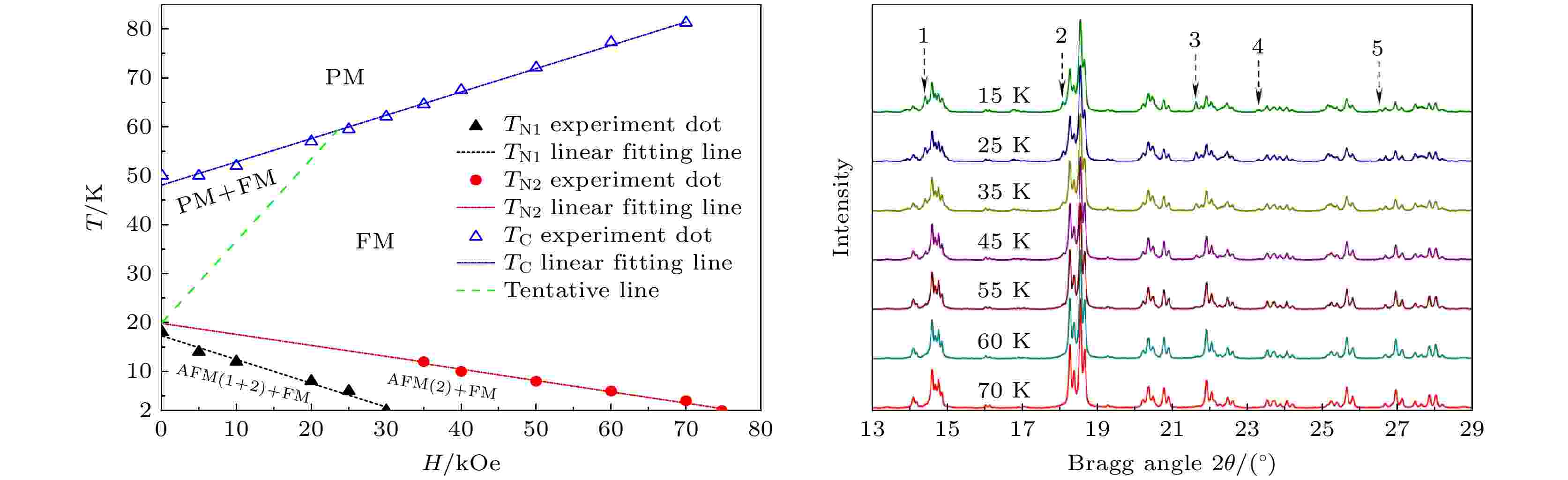 为了明确La0.9Pr0.1Fe12B6合金的变磁相变属性和对应的晶体结构特征, 以及伴随的磁热效应, 本文研究了该合金在磁场诱导和温度诱导下的变磁相变过程及其对应的X射线衍射图谱(X-ray diffraction spectrum, XRD)变化, 并对不同测量模式下磁热性能进行深入对比. 结果表明, La0.9Pr0.1Fe12B6合金主相在低场升温过程中, 温度诱导的磁相变顺序为反铁磁态→铁磁态→顺磁态; 在等温磁化过程中, 在不同温度区间呈现出了3种磁场诱导的变磁相变, 即在低温时的两种反铁磁态(antiferromagnetic, AFM)与铁磁态(ferromagnetic, FM)之间的相变, 以及高温的顺磁态(paramagnetic state, PM)与FM态之间的相变, 且其对应的临界磁场(critical magnetic field, HC)比LaFe12B6母合金的低得多. 零场和加场变温XRD图谱显示La0.9Pr0.1Fe12B6合金的主相在磁无序和有序态间的转变过程中, 会伴随磁晶耦合现象, 其结果是XRD图谱中除原有主相的衍射峰外, 还会出现一些PM态下无法观察到的新衍射峰, 并且其强度随着温度的降低或磁场的增大而增强. 另外, 在基于连续测量模式下的等温磁化数据所计算的磁熵变随温度变化曲线中, 可在居里温度附近观察到因磁场诱导PM-FM一级变磁相变而导致的大磁熵变($ \Delta {S_{\text{M}}} $), 如在70 kOe的磁场下, 在50 K附近的最大磁熵变可达19 J/(kg·K), 相对制冷量约为589.1 J/kg. 然而在同样的测量模式下, 却没有观察到因AFM-FM变磁相变所期望的大磁熵变. 但采用非连续测量模式, 则同样观察到AFM-FM变磁相变过程伴随的大磁熵变, 如在70 kOe的磁场下, 8 K附近的最大磁熵变可达–12 J/(kg·K).