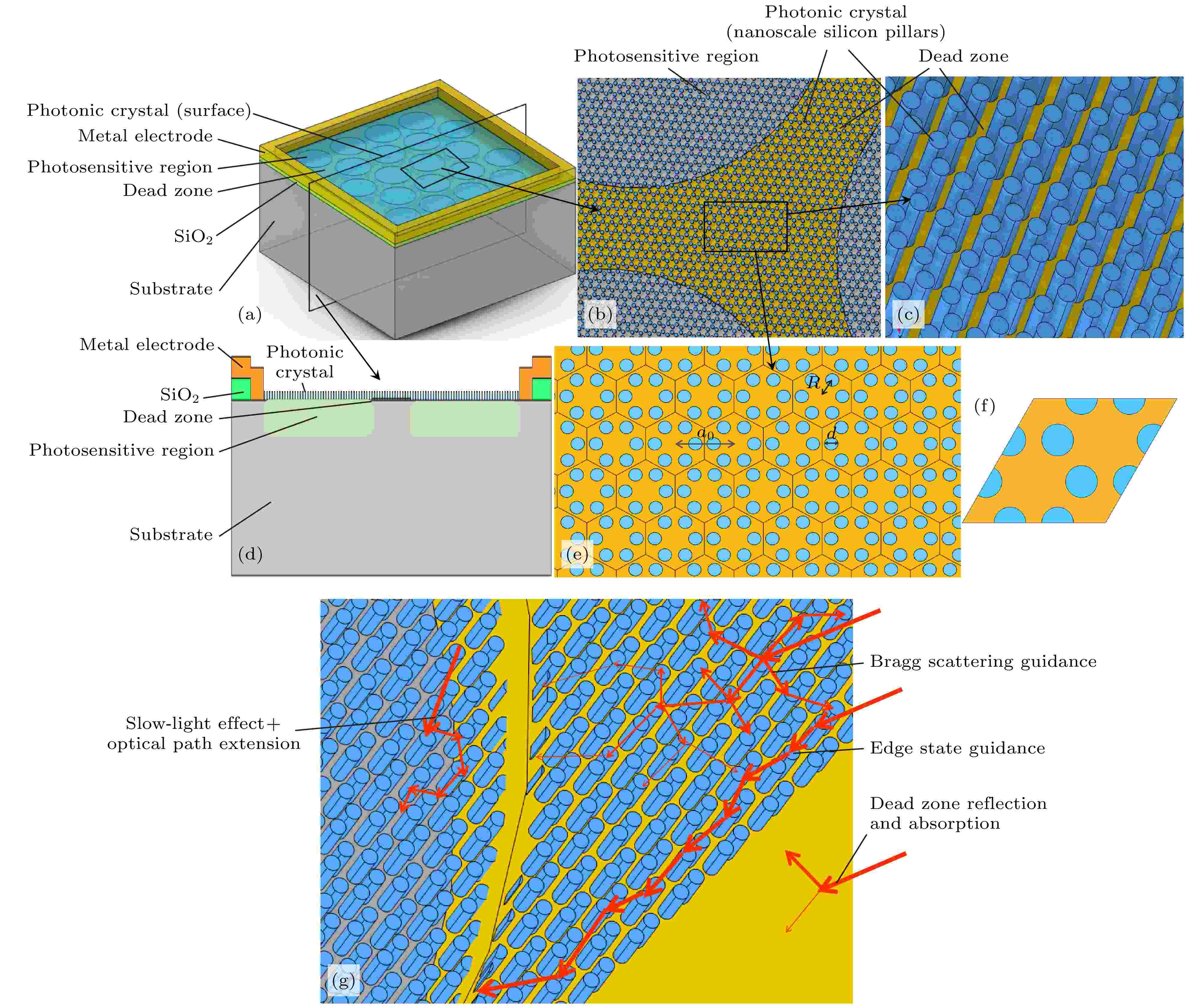 硅光电倍增管(SiPM)在微弱光探测领域已获得广泛应用. 然而基于小尺寸G-APD单元的SiPM存在有效几何填充因子(GFF)受限问题, 使其光子探测效率(PDE)相对较低. 此外, 受硅材料本征特性制约, 其在近红外波段的PDE亦相对不足. 针对上述问题, 本文提出一种基于拓扑光子晶体(TPC)的分区域光场调控方案, 旨在不改变SiPM内部结构的前提下提升其PDE. 通过COMSOL电磁波频域仿真, 揭示了死区拓扑边缘态引导、光敏区慢光效应及布拉格散射的多波段协同机制: 在460—700 nm波段, 死区蜂窝晶格通过Floquet周期性分析诱导拓扑边缘态, 同时利用晶格周期性介电分布激发布拉格散射, 减少光子在金属表面的反射损耗, 将光子精准耦合至光敏区, 其在621 nm处的有效GFF从46.4%提升至63.1%; 在700—1100 nm波段, 除布拉格散射减少反射损耗外, 所设计的周期性硅柱结构可通过慢光效应有效延长光子横向传播路径, 进而提升与光敏区耦合概率, 其在900 nm处的吸收效率由41.19%显著提升至55.94%. 仿真结果表明, 该设计方案使SiPM在460—1100 nm波段PDE平均提升50% (峰值达81%), 可以通过主流的刻蚀工艺(电子束光刻+反应离子刻蚀)实现. 与传统微透镜及等离激元结构相比, TPC在宽光谱响应与工艺简化方面具有显著优势. 本研究为SiPM的光子回收与PDE增强提供了拓扑光子学新路径.