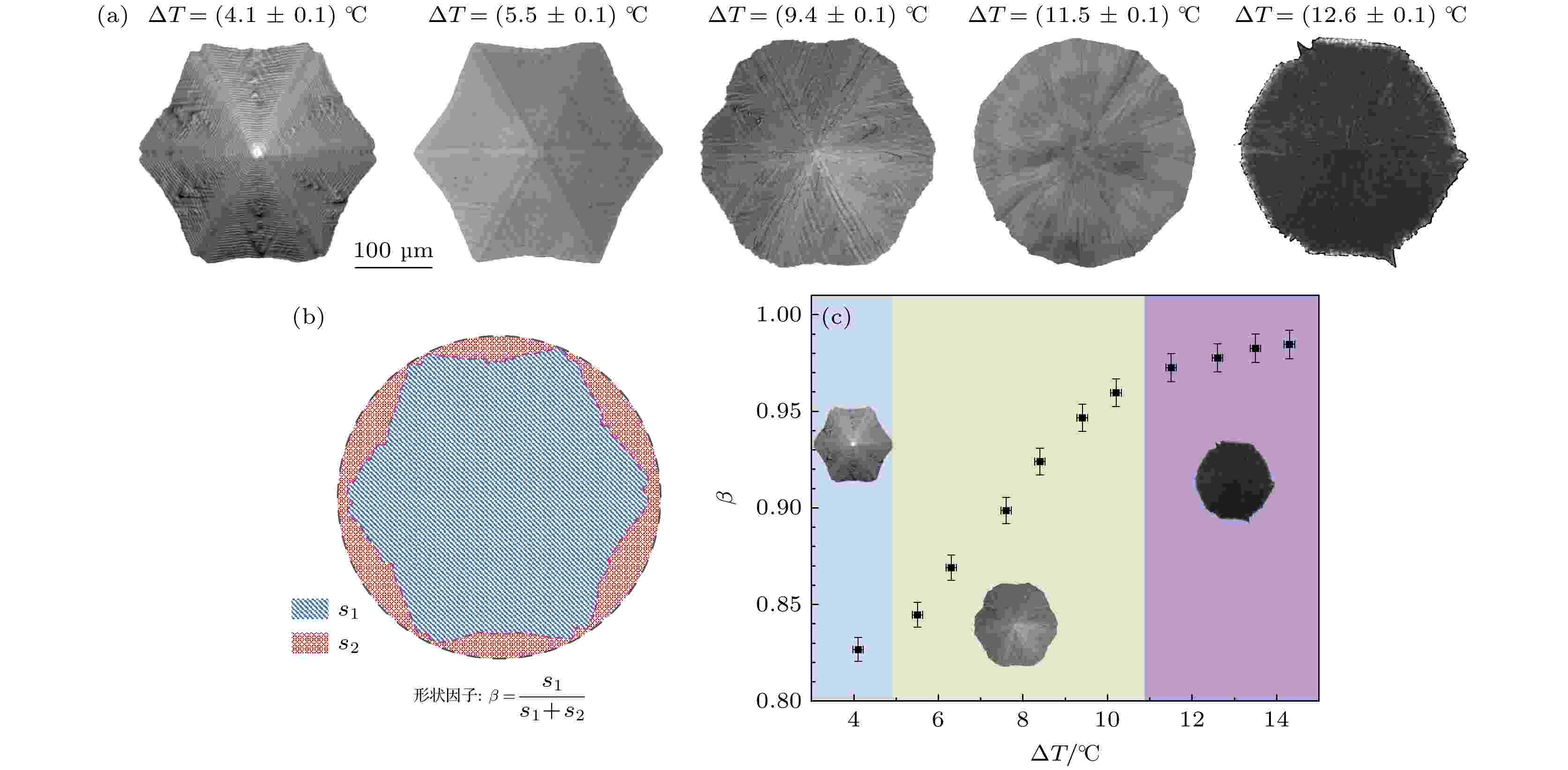 液滴及液膜冻结广泛存在于自然界与工程应用中, 近年多组分液滴体系已揭示界面流动与溶质再分布的普遍机制. 然而, 液滴界面曲率与视场限制使对单个分离冰片的连续显微原位观测受限. 鉴于液滴与液膜在冻结过程中的界面传热与溶质传输机理具有相似性, 本文采用平坦多组分液膜体系, 观察在冷表面上对异丙醇-水二元液膜在不同过冷度下的冻结过程, 开展对单个分离冰片的显微原位研究. 实验发现冰片外形随过冷度由六棱锥逐渐转变为十二棱锥和圆锥形, 并伴随透明度下降. 建立了考虑溶质扩散、热扩散与马兰戈尼效应的物理模型, 揭示了冰片形貌变化的主导机制. 结果表明, 冰片结构演化受溶质浓度梯度主导, 流动与扩散的竞争控制其各向异性生长特征. 本文为多组分液膜冻结过程中的界面动力学提供了新见解.