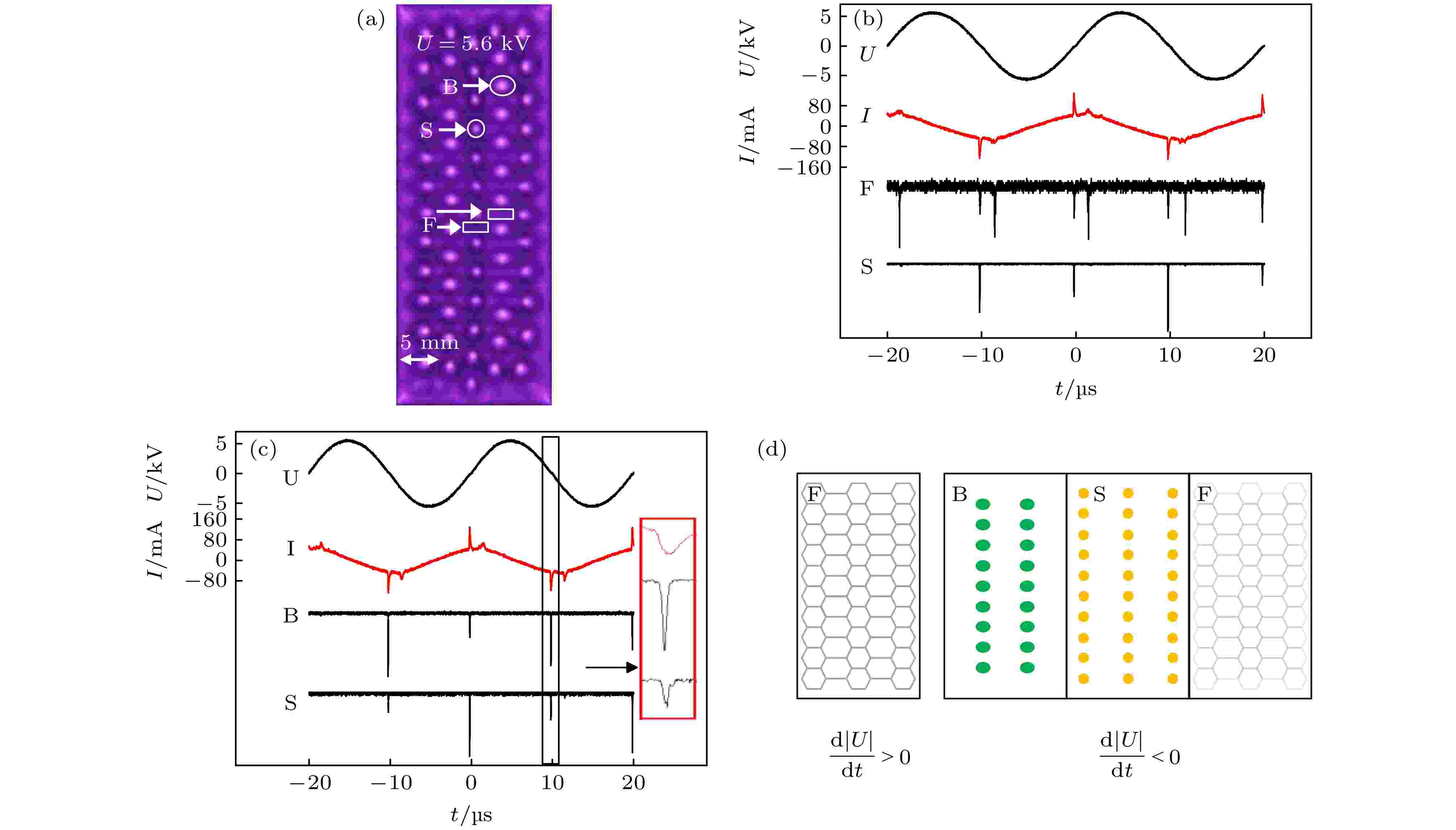 本文设计了一种特殊的完全条纹水电极介质阻挡放电装置, 通过求解拉普拉斯方程发现其产生了条纹状非均匀电场. 采用该装置在空气和氩气的混合气体放电中, 观测到了多种具有D2h对称性的条纹斑图, 其中4种条纹超点阵斑图为首次获得. 选取其中结构最复杂的大小点蜂窝条纹超点阵斑图进行研究, 该斑图由小点、大点和蜂窝框架三套放电丝子结构嵌套构成. 实验利用光谱仪测量了不同子结构的发射光谱, 发现其处于不同的等离子体状态; 采用高速照相机和光电倍增管对其时空动力学进行测量, 发现放电顺序为小点→大点→蜂窝框架, 其中蜂窝框架由随机放电丝叠加而成. 理论上, 通过求解泊松方程模拟了不同时刻的电场分布, 很好地解释了上述斑图的形成机制.