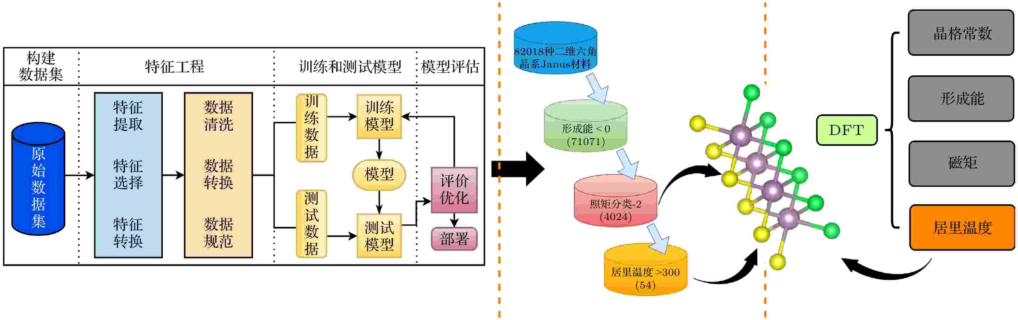 二维Janus磁性体系因空间反演对称性破缺, 易产生较大的DMI作用项(Dzyaloshinskii Moriya interaction), 为探索磁拓扑结构及发展新一代赛道级磁存储器件提供了理想的平台. 在该研究领域中, 寻找具有高居里温度的体系至关重要, 这直接关系到材料在实际高温环境下的磁性能稳定性与应用潜力. 本研究基于已有文献报道与开源数据库, 构建了包含16880种ABC型二维材料的数据集. 以材料的化学计量比、元素固有属性及电子结构特征为描述符, 分别采用随机森林、梯度提升决策树、极端梯度提升和极端随机树4种机器学习模型, 对二维材料的居里温度展开预测训练, 并通过十折交叉验证评估模型的学习性能. 研究结果表明, 极端梯度提升模型对居里温度的预测精度最高且具备最优的泛化能力. 基于最优模型, 对4024种尚未探索的二维Janus结构材料进行了居里温度预测, 最终筛选出54种同时具备热稳定性、高磁矩、高居里温度的二维Janus材料. 为验证预测结果的可靠性, 研究进一步结合第一性原理计算与海森伯模型, 对随机选取的4种候选Janus体系进行了理论验证. 本研究为加速发掘兼具稳定性与高居里温度的二维Janus磁性材料提供了新的技术途径, 对推动二维磁性材料在信息存储等领域的应用具有重要意义.