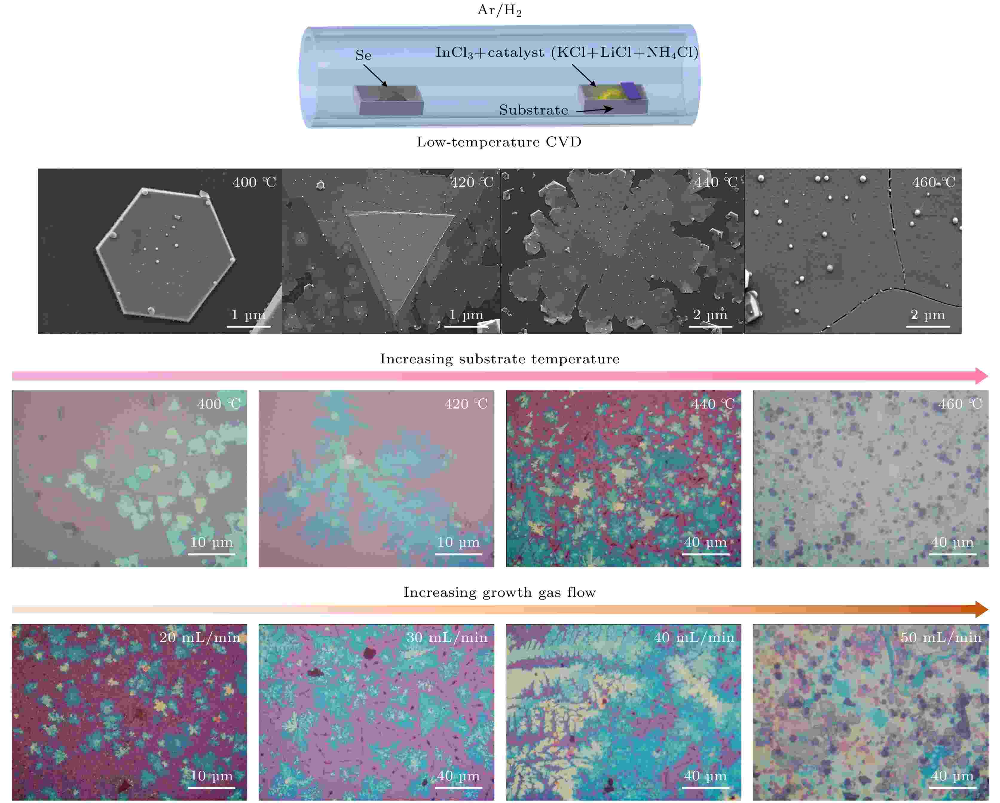 二维铁电半导体α-In2Se3在新型电子器件中具有重要应用前景. 然而采用化学气相沉积法(CVD), 该材料通常需要高于650 ℃的高温. 本研究提出一种低温合成策略, 通过引入KCl/LiCl/NH4Cl三元催化剂体系, 在400—460 ℃ (优化条件440 ℃)制备α-In2Se3薄膜, 该工艺较传统方法降低温度200 ℃以上. 扫描电子显微镜(SEM)表征显示材料形貌可通过温度与气体流速协同调控, 从六边形薄片转变为连续均匀薄膜; 能量色散谱仪(EDS)分析表明元素比例接近理想化学计量比(In∶Se = 36.38∶63.62); 拉曼光谱(特征峰103/180/195 cm–1) 与X射线光电子能谱(XPS) (In∶Se = 1.92∶3.00) 共同证实材料为纯α相、化学计量比接近理想值. 基于此材料构建的阻变器件表现出模拟阻变的特性, 模拟了生物突触的长时程增强/抑制行为. 在人工神经网络仿真中, 对MNIST数据集的图像识别准确率均在90%以上. 该低温合成工艺突破高温限制, 为α-In2Se3在硅基神经形态计算芯片中的规模化集成提供可行路径.