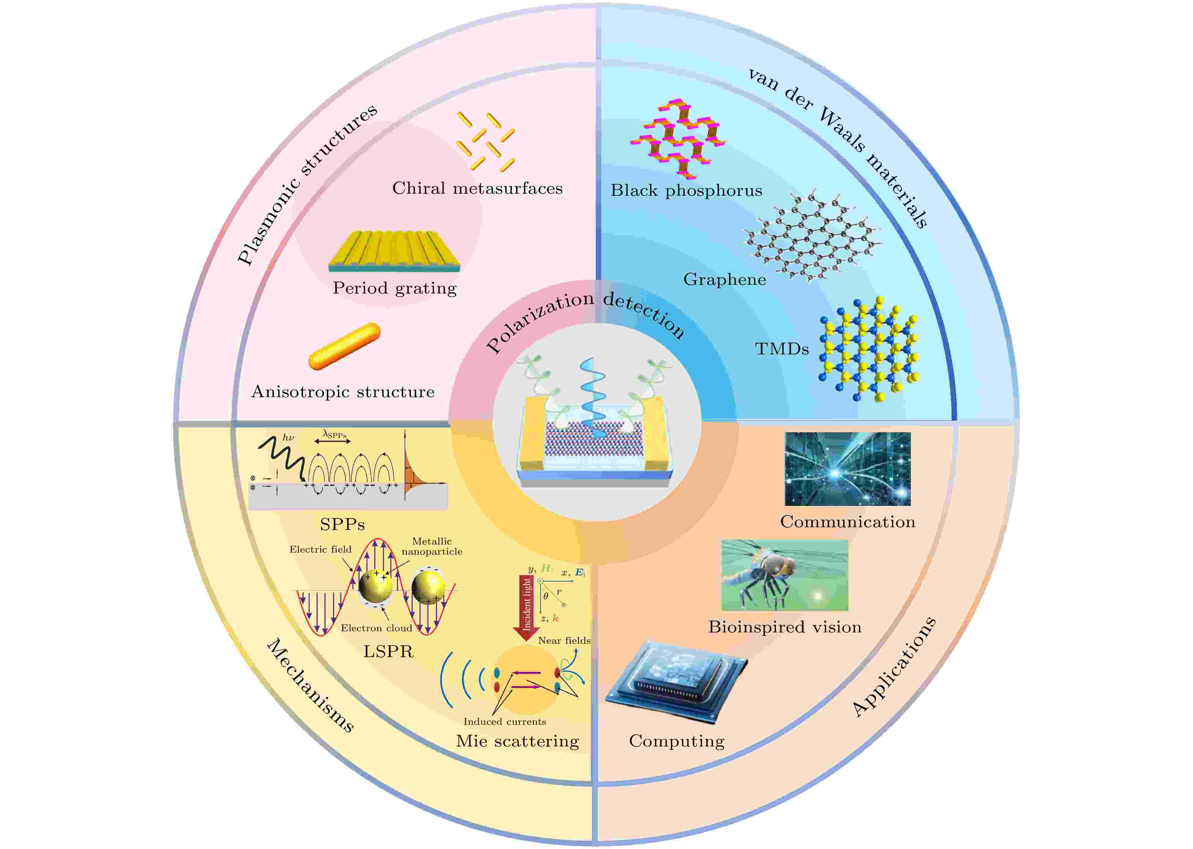 偏振探测是获取光矢量信息的重要手段, 广泛应用于光通信、智能感知与生物传感等领域. 二维范德瓦耳斯材料因其独特的各向异性与可调电学特性, 为实现高性能偏振探测提供了新的材料平台, 但这类材料存在本征吸收弱、响应效率有限等局限性. 等离激元结构可在微纳尺度实现强局域光场调控, 是突破上述局限性、提升探测性能的重要手段. 本文系统梳理了等离激元微纳结构与范德瓦耳斯材料的光学耦合机制, 分析了不同类型等离激元结构在各类偏振光探测中的作用与优势. 最后, 讨论了该方向在偏振敏感光通信、片上光计算与信息处理、仿真视觉与图像识别等前沿领域的应用前景, 展望了未来研究面临的机遇与挑战.