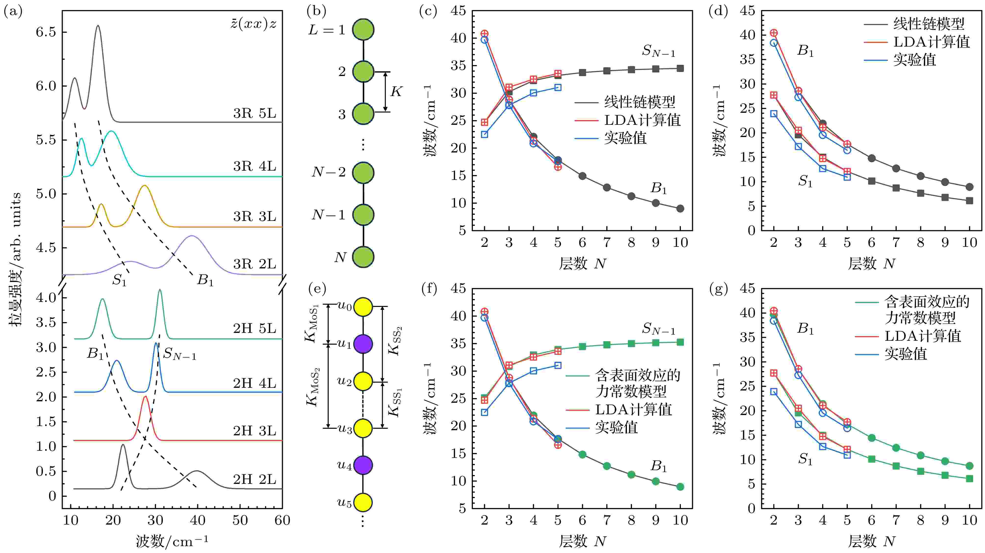 本文系统研究了过渡金属二硫化物3R相MoS2的声子性质, 并与常见的2H相进行了对比. 研究通过拉曼光谱实验结合线性链模型、力常数模型和键极化模型, 对不同堆垛结构的振动模式、峰位及强度演化规律进行了深入分析. 结果表明, 高频拉曼光谱难以有效区分两种相, 但二次谐波对晶体对称性极为敏感, 可清晰实现堆垛相的鉴别; 在低频区域, 线性链模型能够刻画剪切模与呼吸模的层数依赖性, 而力常数模型因引入层内和层间的力常数后能更准确地拟合实验趋势; 键极化模型进一步解释了不同堆垛结构下拉曼散射强度的差异; 在高频区域, 3R相的峰位差对层数变化更加敏感, 因而在层数判定中具有更高的可靠性, 同时表面效应在其高频声子行为中起着更为关键的作用. 综上所述, 本文全面揭示了3R相MoS2的独特声子特征及层数依赖性, 为低维材料的堆垛结构识别和物性调控提供了重要依据, 并为其在光电器件、量子器件中的应用奠定了基础.