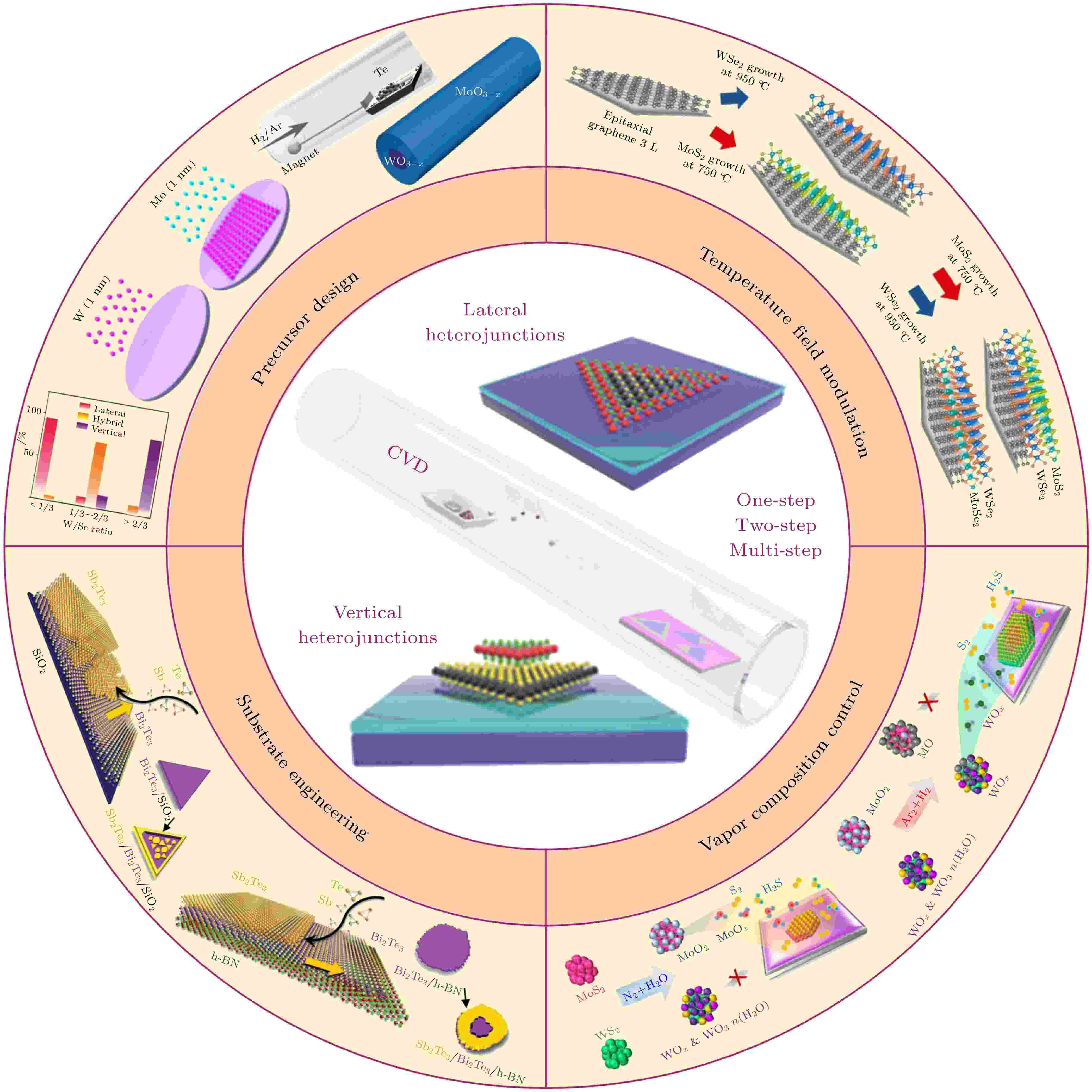 二维(two-dimensional, 2D)异质结因其能整合不同组分的材料并产生新颖物理现象, 已成为构筑下一代光电子与微电子器件的理想平台. 化学气相沉积(chemical vapor deposition, CVD)技术是实现其大面积、高质量、可控制备的关键途径. 本综述系统梳理了CVD法制备2D异质结的最新进展, 重点阐述了通过前驱体设计、温度场调控、气体诱导及衬底工程四大核心策略, 在精准调控异质结结构(垂直/横向)、界面、组分及结晶质量方面的机理与成果. 目前该技术仍面临较大挑战, 未来通过融合原位表征、多尺度模拟与人工智能优化, 有望实现从“经验试错”到“精准设计”的跨越, 推动2D异质结在量子计算、柔性电子等前沿领域的实际应用.