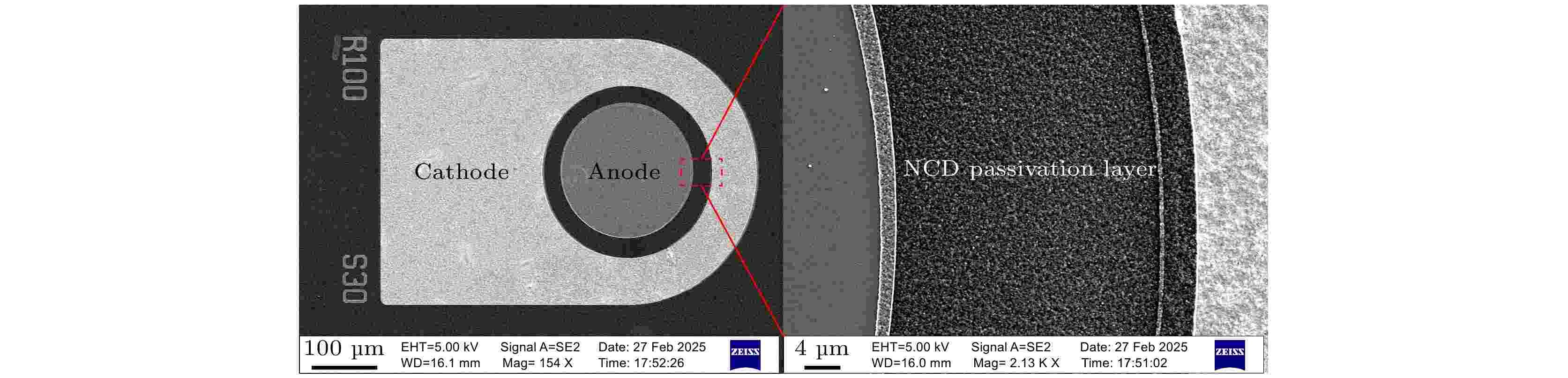 高输出功率密度下的热积累问题是氮化镓基功率器件面临的关键瓶颈之一. 纳米晶金刚石钝化层策略在GaN基高功率器件散热方面发挥着重要的作用. 在硅基AlGaN/GaN异质结材料上制备了厚420—440 nm、晶粒尺寸330—380 nm的纳米晶金刚石薄膜, 制备了纳米晶金刚石钝化的GaN基横向肖特基二极管器件, 并对比研究了其与SiNx钝化器件的电学、热学性质. 测试结果显示, 在直流偏置下, 有无纳米晶钝化层的二极管器件正向特性基本一致; 在–20 V偏置电压下, 对两种器件施加2.5 V脉冲电压后, 纳米晶钝化二极管电流密度仅退化2.6%, 而SiNx钝化器件电学特性几乎完全退化, 表明纳米晶金刚石钝化二极管具有对电流崩塌现象优异的抑制能力; 在变直流功率条件下对两种器件的热成像显微观测结果显示, 发生热损毁时, SiNx钝化器件输出功率密度约4 W/mm, 而纳米晶钝化器件则约为7.5 W/mm. 本文是纳米晶金刚石钝化工艺在GaN基功率二极管散热应用的首次报道, 充分证明了该策略在GaN基功率二极管方面的应用潜力.