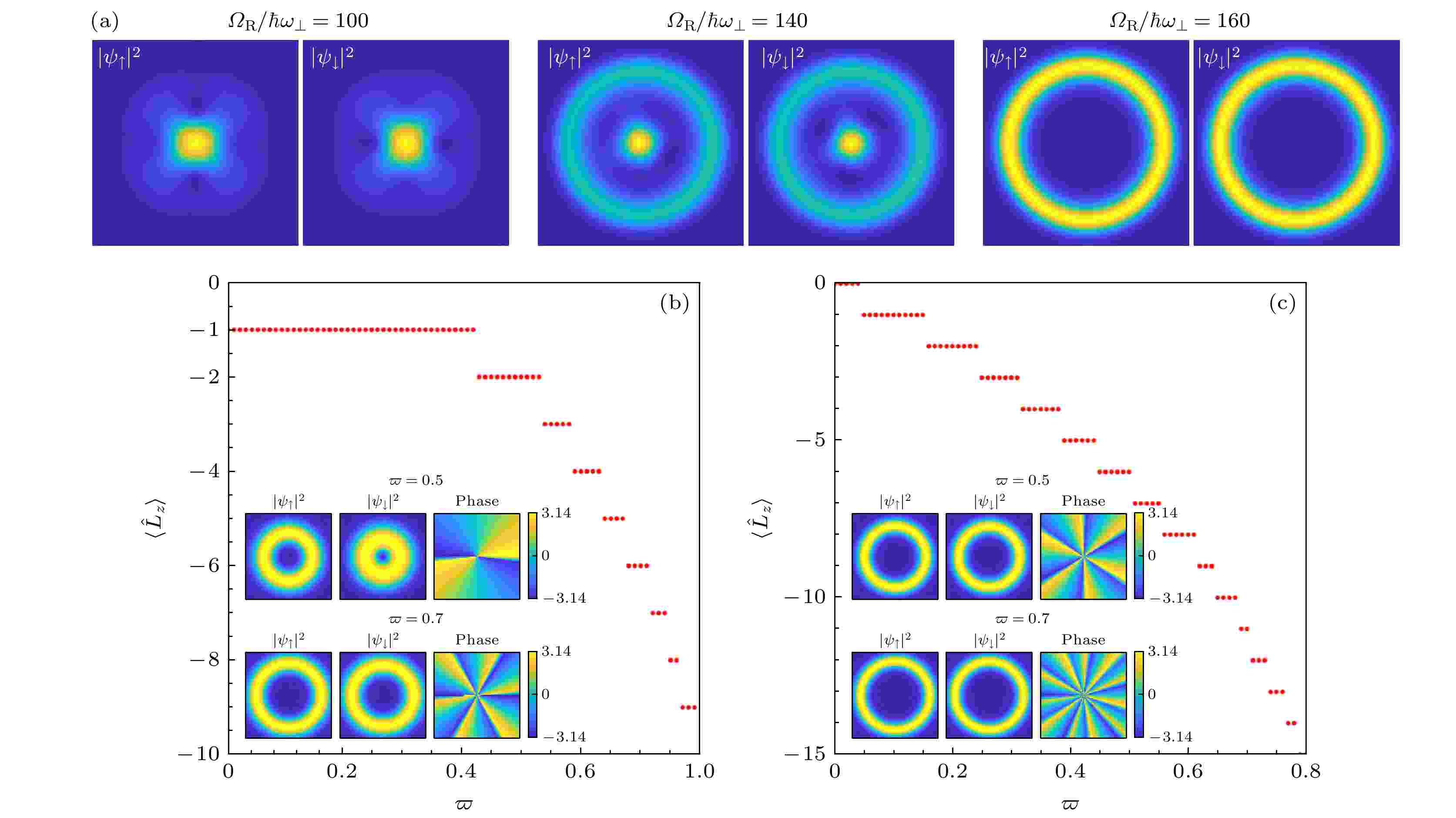 本文以旋转自旋-轨道角动量耦合玻色-爱因斯坦凝聚体为对象, 通过数值求解单粒子定态Schrödinger方程和具有平均场相互作用的Gross-Pitaevskii方程, 研究了自旋-轨道角动量耦合与旋转对单粒子基态性质和平均场相互作用基态性质的影响, 发现旋转将导致角动量空间中单粒子能谱的二重简并消失, 单粒子能谱不再是关于零点角动量左右对称, 单粒子基态和平均场基态为占据单个角动量的涡旋态, 其角动量大小与旋转频率、激光强度和自旋-轨道角动量耦合有关. 当旋转频率小于临界值时, 基态涡旋的角动量大小不受旋转频率的影响. 当旋转频率超过临界值时, 基态涡旋的角动量大小将随着旋转频率的增加而增加.