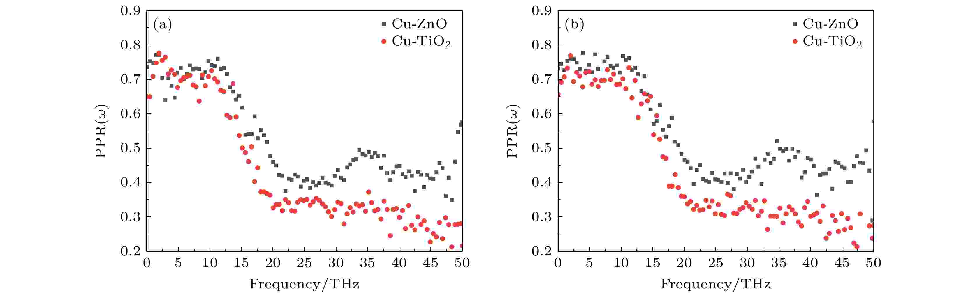 为了优选等离激元太阳能分解水体系中金属和半导体的复合光电极, 本文采用非平衡分子动力学方法计算了等离激元金属Cu, Ag和Au与半导体TiO2, ZnO和MoS2的复合电极在不同温度下的界面热导, 并通过计算声子态密度和声子参与率研究了不同频率的声子与界面热导的关系. 结果表明, 随温度的增加, 不同复合电极的界面热导增加. 在相同的半导体TiO2上, Cu-TiO2和Ag-TiO2界面热导均高于Au-TiO2, Cu-TiO2复合电极的界面热导在800 K时可以达到973.56 MW·m–2·K–1. 对于等离激元金属Au, 相对MoS2和TiO2, 其与ZnO复合的界面导热更高; 而对于等离激元金属Cu, Cu-TiO2的界面热导高于预测的Cu-ZnO, 这取决于更多处于核心热输运频段的低频声子参与界面热输运.