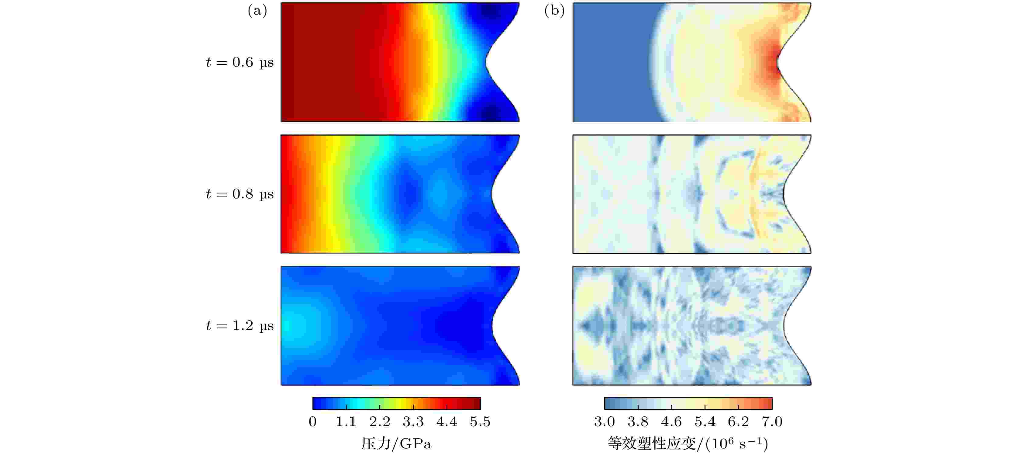 强度应变率效应是动态本构模型研究的关键问题, 金属自由面Richtmyer-Meshkov不稳定性实验反映了极端高应变率下材料强度行为. 本文针对冲击压力5.5 GPa的锡自由面Richtmyer-Meshkov不稳定性实验, 采用3种本构模型进行模拟. 基于弹性理想塑性模型获得与实验一致的自由面扰动尖钉速度极大值即可获得锡材料等效强度, 发现强度在~106 s–1应变率时比准静态~10–4 s–1应变率增大约64倍, 应变率硬化十分显著. 弹性理想塑性模型和Steinberg-Cochran-Guinan模型虽能捕捉尖钉速度极大值, 但却无法复现实验中速度下降的卸载过程; 而引入应变率效应的应力松弛模型获得了与实验一致的整个尖钉速度历程. 揭示了强度应变率效应的影响贯穿扰动发展过程, 将可供动态本构模型研究的实验数据从单一速度极大值拓展为全过程速度曲线, 大幅提升了实验数据的利用效率, 对极端高应变率下动态本构模型研究具有重要价值.