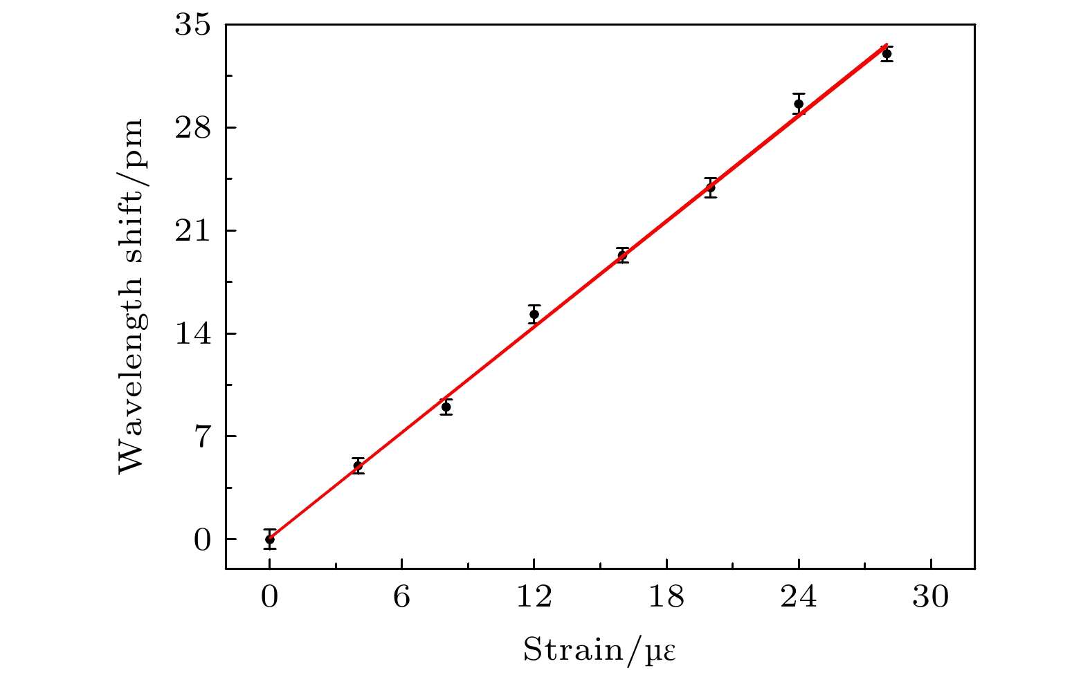 超窄线宽π相移光纤布拉格光栅在光纤传感领域发挥着重要的作用, 但是这种超窄线宽π相移光纤布拉格光栅对输入光强度非常敏感, 输入光在光栅内部产生光热效应会引起频率移动, 降低了光栅的测量精度, 同时激光器自身的频率漂移也会增大测量误差. 本文提出使用超窄线宽π相移光纤布拉格光栅进行高精度应变测量的方法, 采用单光子调制技术锁定激光频率到38 MHz超窄线宽π相移光纤布拉格光栅, 同时消除了光栅内部光热效应和激光频率起伏对应变测量的影响, 对于0—30 με范围的外部应变实现了测量精度为0.05 με的高精度测量, 该方法在航空航天、土木工程、能源工程等领域具有重要应用价值.