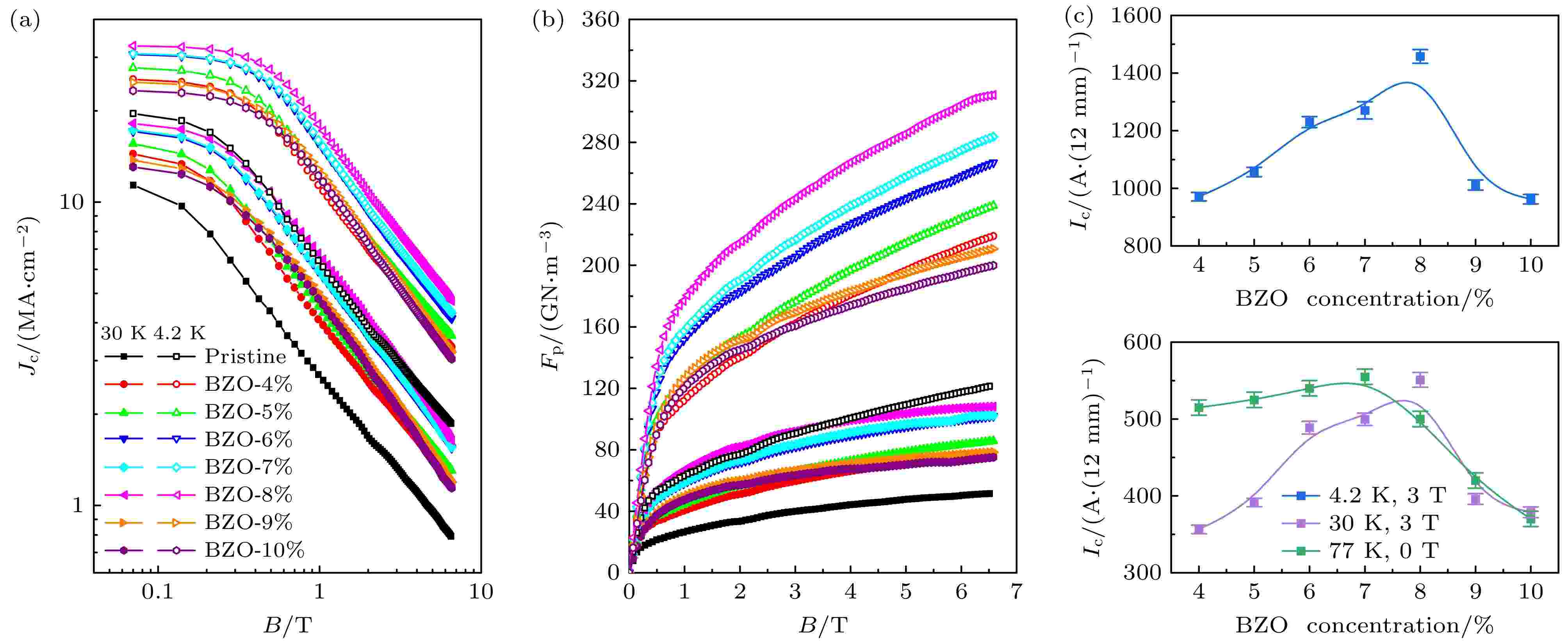 为解决传统元素掺杂YBa2Cu3O7–δ (YBCO)薄膜时掺杂相尺寸不可控和分布不均匀的问题, 本文采用预制纳米晶添加技术在YBCO高温超导带材中引入了弥散分布的小尺寸BaZrO3 (BZO)纳米晶作为磁通钉扎中心, 显著提高了YBCO薄膜在低温下的在场性能. 本文系统研究了原始尺寸约为8 nm的BZO纳米晶不同浓度的添加效果. 实验结果表明, 在4.2, 30和77 K温度条件下, BZO纳米晶添加对YBCO的自场和在场性能提升的最佳摩尔百分比浓度为8%. 在30 K@3 T时, BZO-8%的Fp约为92.06 GN/m3, 分别是BZO-4%和原始样品的1.54倍和2.3倍.