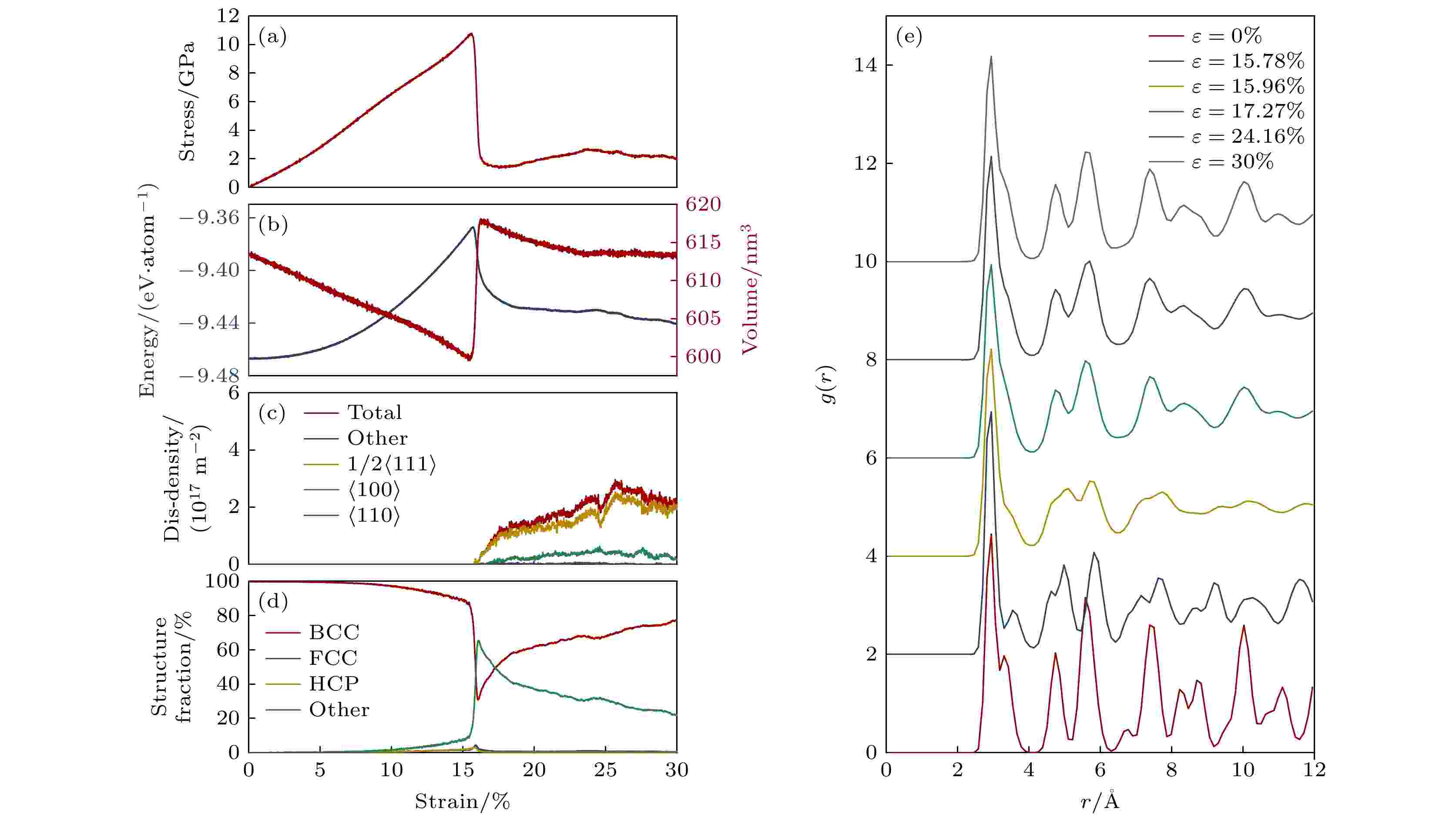 难熔多主元合金因其优异的高温性能和潜在工程应用成为材料领域研究热点, 其中NbTaTiZr四元多主元合金在高应变率与极端温度下的变形机制与力学行为尚不明确. 为揭示该合金的原子尺度响应规律, 构建了NbTaTiZr四元机器学习势, 结合分子动力学模拟系统研究了晶体取向、应变率、温度及组分对合金压缩力学行为的影响. NbTaTiZr在压缩时呈现出结构与力学响应的各向异性, 沿[111]晶向压缩时拥有最高屈服强度; 而沿[110]晶向压缩时的屈服强度最低, 在变形过程中更易产生孪晶; [100]晶向主要通过局域无序及位错滑移协调变形, 主导位错类型为1/2$ \left\langle{111}\right\rangle $. 应变率提升至1010 s–1时, 屈服强度显著增强且无序结构比例增大, 高应变率加载下通过抑制位错运动促进无序化转变. 该合金在2100 K高温下仍保持较高强度, Nb/Ta元素占比增加可显著提升屈服强度, 而Ti/Zr元素则产生负面效应. 研究揭示了多主元合金力学行为的各向异性特征与无序化转变的应变率依赖性, 为设计高性能难熔合金提供理论依据.