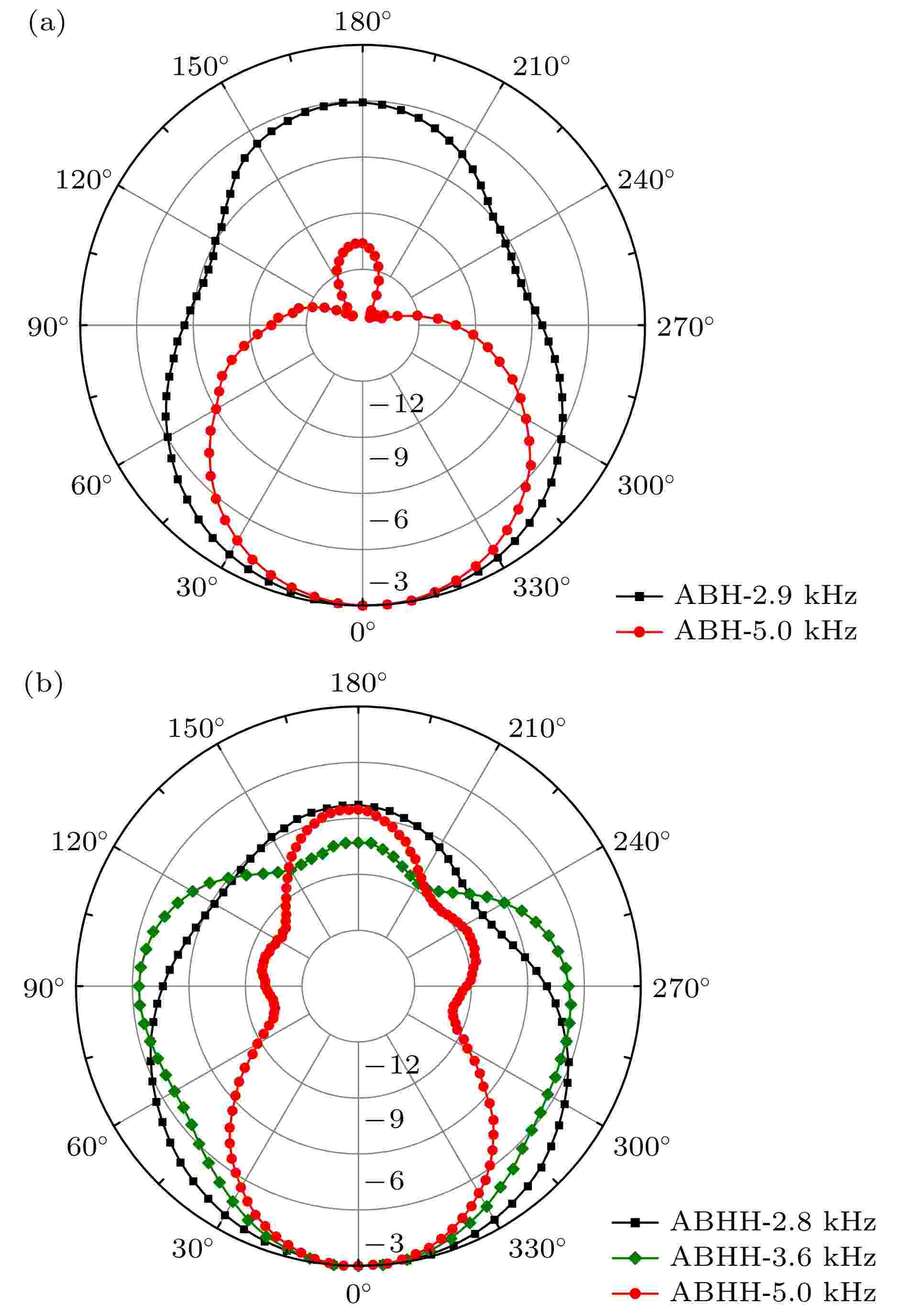 针对目前水下微弱信号探测对水听器高灵敏度的需求, 提出一种声学黑洞结构形式的高灵敏度水听器. 从几何声学出发, 将声学黑洞中弯曲波汇聚特性类比为水声学中声线弯曲, 提出一种波聚集特性简化理论. 基于该特性设计了一种二维声学黑洞水听器, 通过在弯曲式水听器中引入二维声学黑洞结构, 实现振动聚集, 进而提升水听器的高灵敏度性能. 通过结构控制变量, 对比分析4种厚度形式板, 验证了声学黑洞板在1.7—5.8 kHz频段内提高水听器接收灵敏度的显著优势. 分析了声学黑洞结构水听器接收灵敏度起伏较大的原因, 并进一步设计了声学黑洞与单端开口Helmholtz液腔耦合水听器, 将前两阶声学黑洞弯曲振动模态与液腔模态耦合实现宽带接收特性. 制作了两种水听器样机并在消声水池中进行测试. 结果表明, 二维声学黑洞水听器通过弯曲振动聚集效应可有效提高水听器接收灵敏度, 并与液腔结构通过多模态耦合形成宽带, 在2.6—5.3 kHz频段内灵敏度最高可达–169 dB, 起伏控制在8 dB以内.