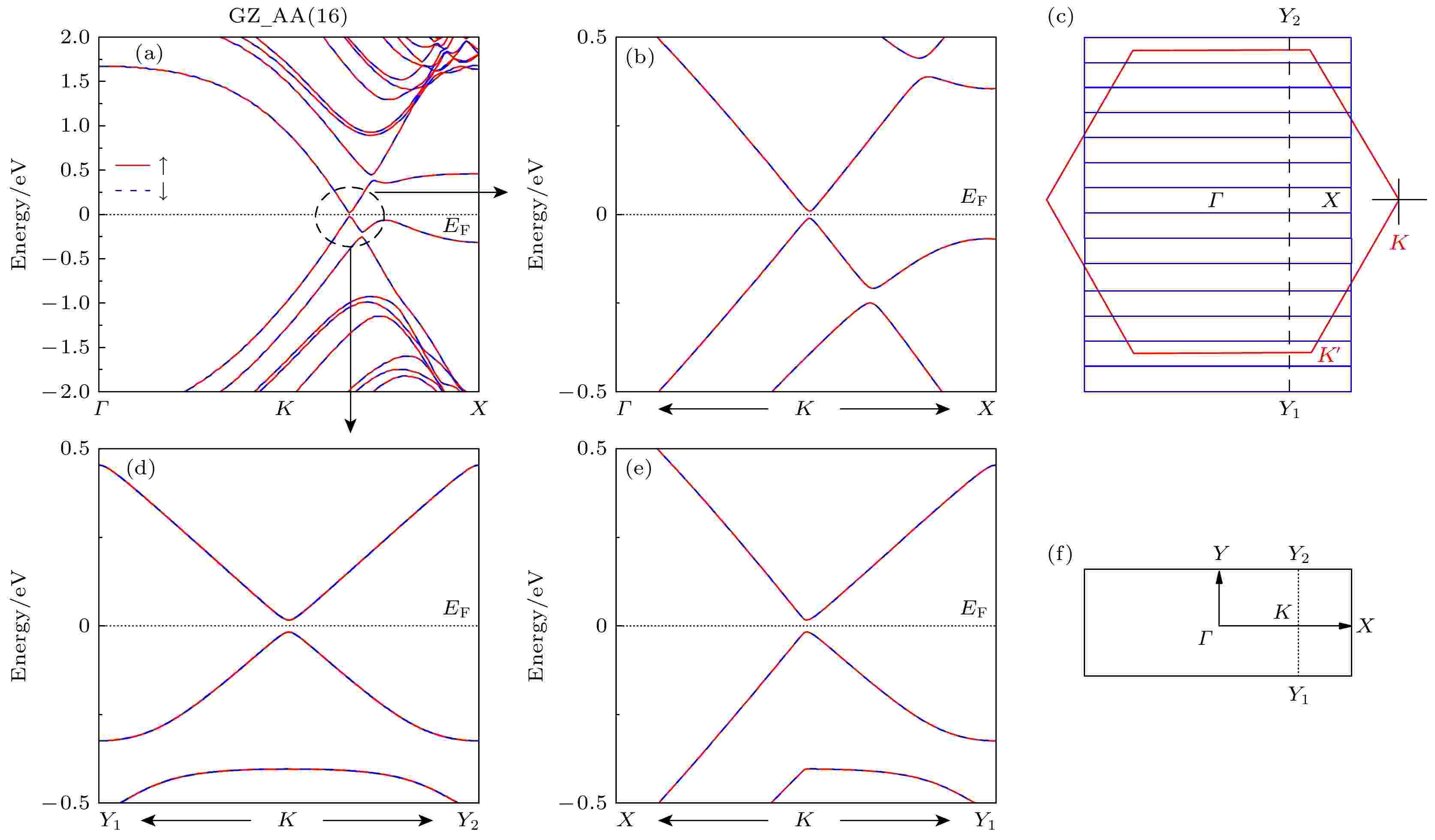 半狄拉克材料的各向异性使其具有独特的载流子传导操控选择性, 目前已分别在黑磷薄膜和拓扑金属ZrSiS材料中成功观测到半狄拉克电子行为, 即在半狄拉克点附近沿两个相互垂直的高对称路径上, 分别存在线性和抛物色散关系. 本文基于第一性原理计算, 预测在石墨烯基底上各向异性堆垛石墨烯纳米带阵列的结构体系中也可实现半狄拉克电子态. 还进一步研究了条带宽度、超胞中石墨烯宽度与条带宽度之比和外加电场对这种半狄拉克体系能带结构的影响. 值得注意的是在外电场作用下, 从计算模拟上分析了导带与价带由非锥型接触转变为锥型接触并逐步成为半狄拉克点的过程, 并相应存在从费米能级附近具有方向依赖的平带金属过渡到直接带隙半导体的相变. 该研究及其结果可能为二维材料纳米结构中半狄拉克电子态的实现与调控提供理论参考.