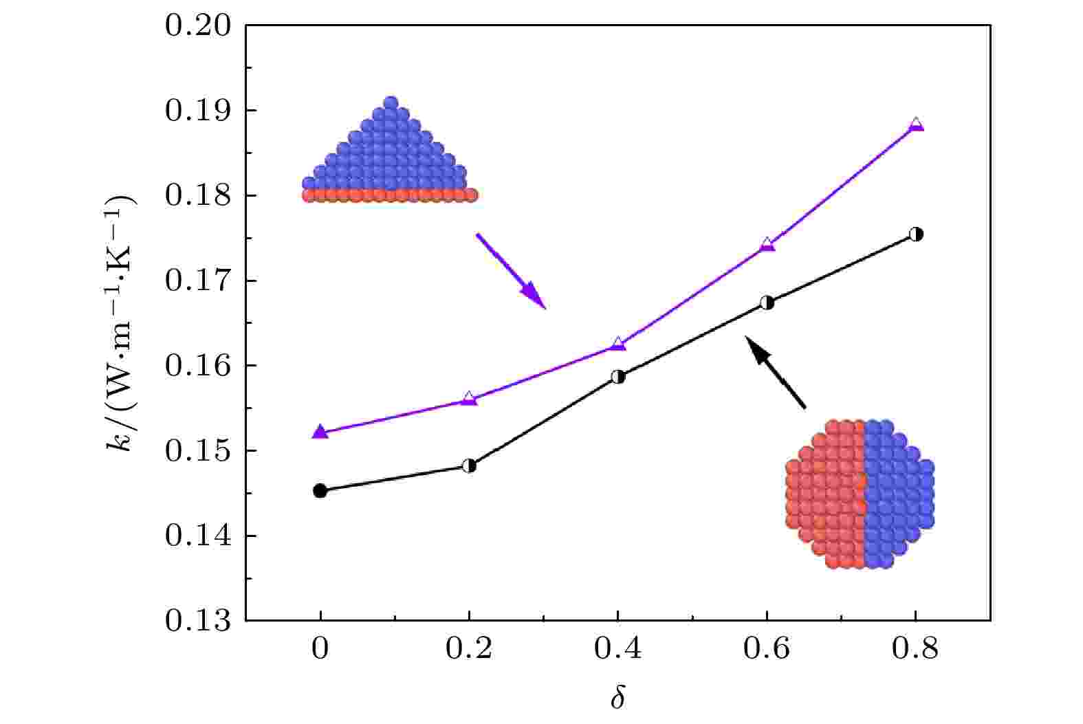 近年来, 纳米技术的发展使得非球形纳米颗粒的工业化应用成为可能, 形貌各向异性的非球形颗粒有利于改善纳米流体的传热性能. 有研究表明, 将Janus 纳米颗粒引入到基液中可进一步增强纳米流体的导热特性. 本文设计了一种具备亲水侧面和疏水底面的锥形Janus纳米颗粒, 并将其引入到基液中形成锥形Janus纳米流体, 采用分子动力学模拟计算了锥形和球形两种Janus纳米流体的热导率, 对其导热机理进行计算分析. 结果表明, 锥形颗粒表面的类固液体层效应更明显, 其在基液中的扩散能力更强, 因此锥形纳米流体具备比球形纳米流体更强的导热性能. 对于Janus纳米流体, Janus颗粒独特的不对称结构使得其在基液中的布朗运动更为强烈, 有效增强了纳米流体内部的传热效率. 因此, 非球形颗粒与Janus颗粒的结合可进一步提高纳米流体的导热性能, 为开发新型传热工质提供了新的思路.