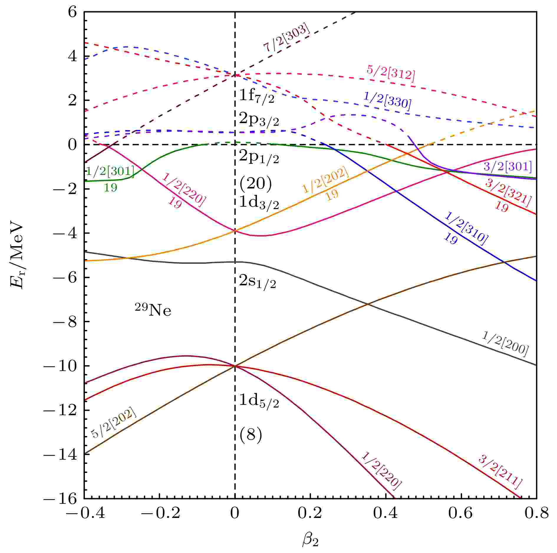 近年来, 29Ne作为$N=20$“反转岛”核区的关键核素, 其基态价中子组态表现出与传统壳模型预期(${\mathrm{f}}_{7/2}$轨道主导)相悖的${\mathrm{p}}_{3/2}$轨道主导特征, 并可能具有晕核结构. 本文基于相对论框架下的复动量表象(CMR)方法, 系统分析了29Ne在四极形变($\beta_2$)影响下的单粒子能级演化、轨道占据概率及径向密度分布. 计算结果表明: 在球形极限($\beta_2=0$)下, $2{\mathrm{p}}_{1/2}$和$2{\mathrm{p}}_{3/2}$能级显著下移至$1{\mathrm{f}}_{7/2}$能级下方, 形成典型的壳层反转; 当$\beta_2 \geqslant 0.58$ 时, 价中子占据由$1{\mathrm{f}}_{7/2}$分裂而成的$3/2[321]$轨道, 但其主要组分为${\mathrm{p}}_{3/2}$(占比68%), 且径向密度分布显著弥散, 符合晕核特征. 这些结果揭示了29Ne的p波主导机制与形变协同作用对晕结构形成的影响, 为反转岛核区的壳层演化提供了新的理论依据.