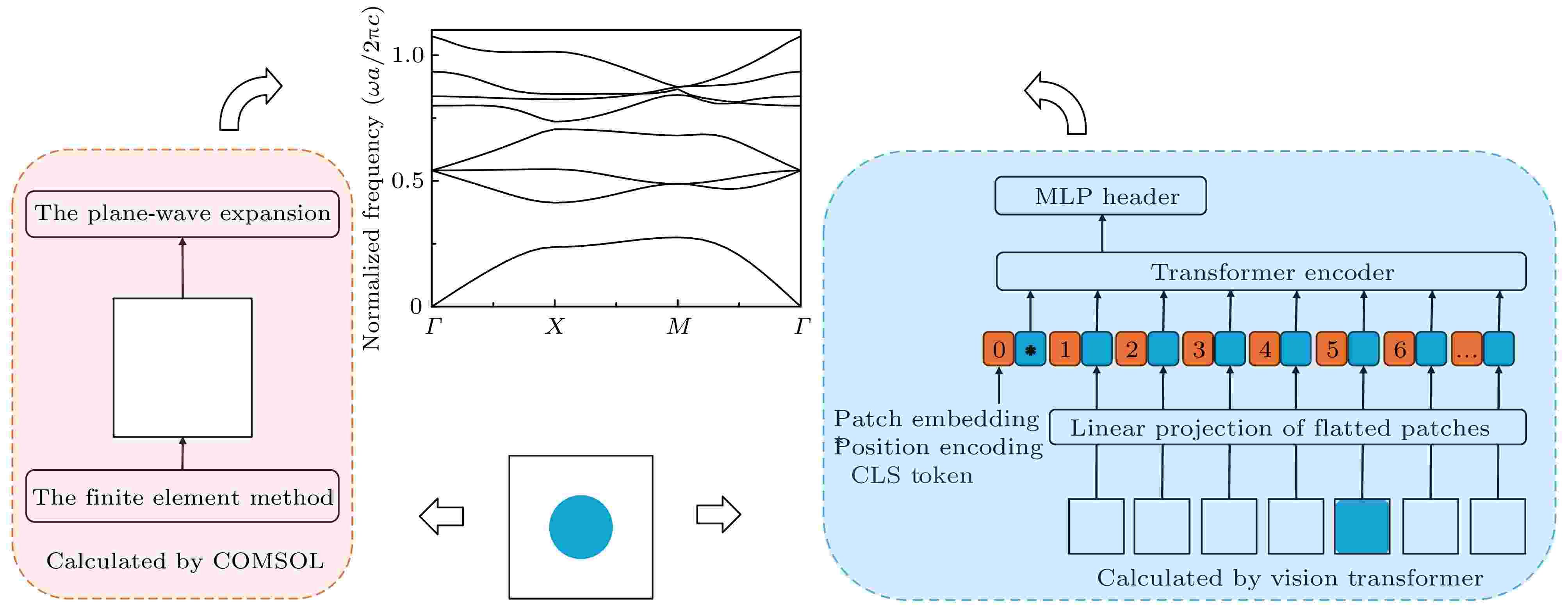 光子晶体因其独特的能带结构在光子学领域具有重要应用前景, 而准确预测其能带结构对于光子器件的设计与优化也至关重要. 鉴于此, 本文应用视觉变换器(vision transformer, ViT)模型, 探索高效、准确的光子晶体能带结构预测方法. 首先, 通过传统数值仿真方法得到光子晶体的能带结构数据, 构建了训练和测试数据集; 其次, 利用数据集对ViT模型进行训练, 训练过程中模型展现出良好的学习能力, 损失函数值持续下降, 最低可至4.42×10–6; 最终, 测试结果表明, ViT模型预测平均均方误差(MSE)低至3.46×10–5, 决定系数(R2)达到0.9996, 表明ViT模型具有极高的预测精度和良好的泛化能力. 研究表明, ViT模型能够有效预测光子晶体的能带结构, 为光子晶体相关研究和应用提供一种新的高效预测工具, 有望推动光子器件设计的进一步发展.