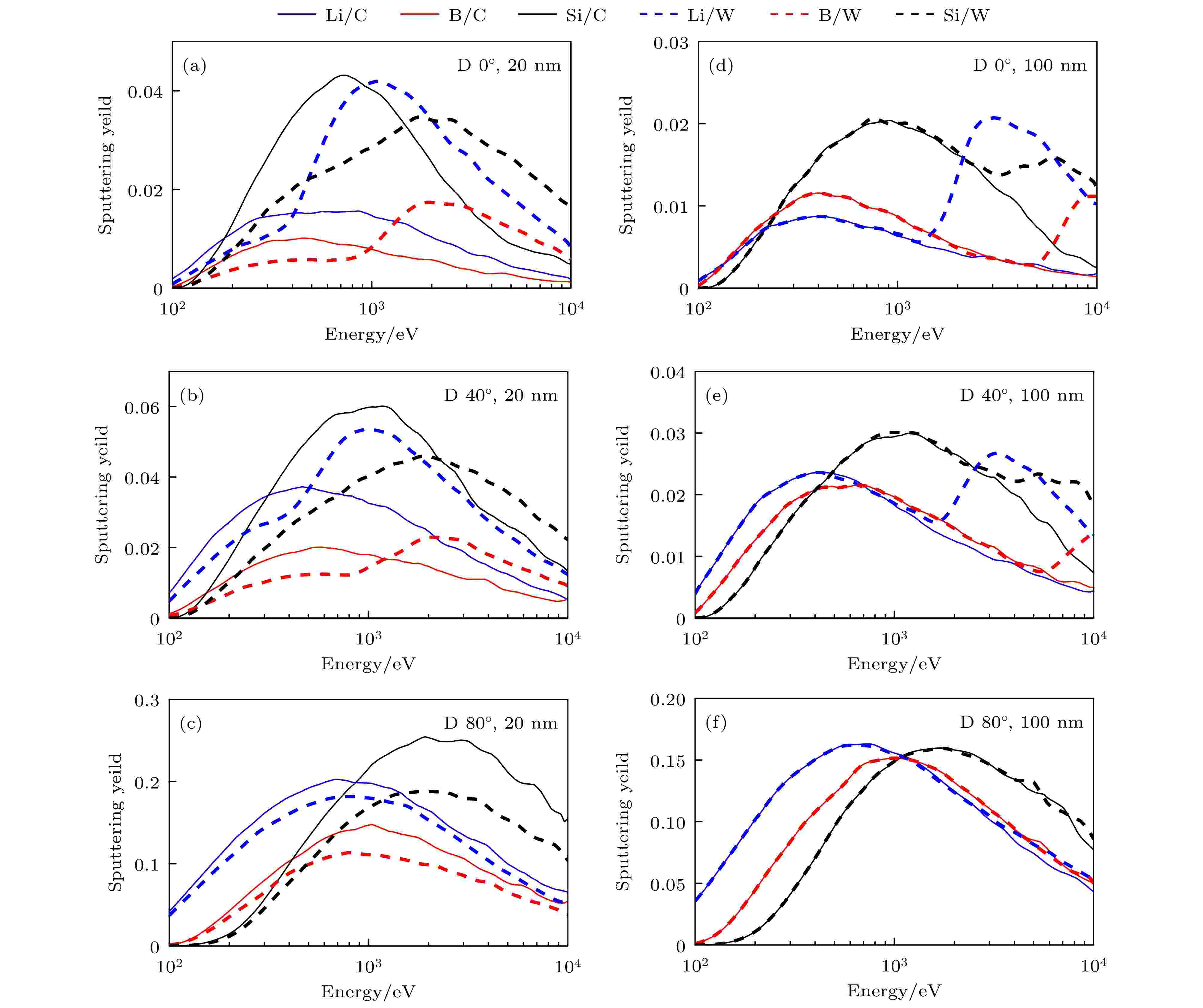 聚变装置表面涂覆壁处理如锂化、硼化、硅化等形成的涂层在高能氘粒子的轰击下会因为物理化学溅射损失, 从而使壁条件变差, 影响等离子体放电性能. 为了评估不同壁涂层的溅射损失行为, 本文采用两体碰撞近似模型, 对以碳、钨为基材的锂、硼和硅涂层材料在氘粒子轰击下的物理溅射行为进行了模拟分析. 结果表明, 因锂具有低的表面结合能而硅具有高的原子序数, 锂和硅分别在一定入射条件下溅射产额最大. 对于双层靶, 钨基涂层的溅射产额在特定能量出现剧增, 主要是由于钨溅射阈值高, 入射粒子在钨界面被大量反射, 并且具有较高的能量. 最后, 由于靶表面成分会随着入射通量增加而变化, 涂层材料的溅射产额也随之变化. 本研究为聚变装置壁处理涂层寿命的评估提供数据支持, 并为壁处理涂层材料设计及处理策略提供了重要的理论参考.