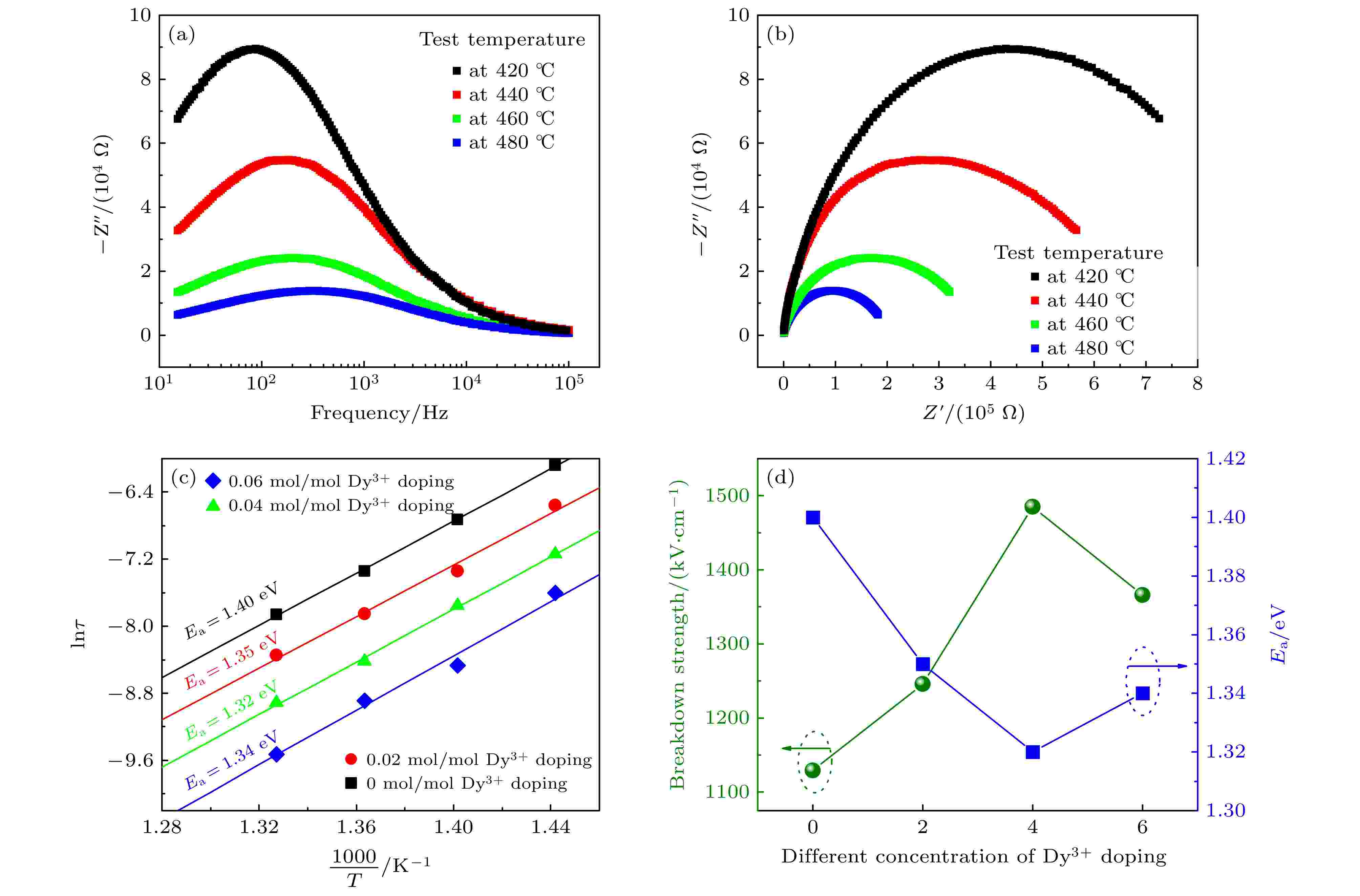 电介质玻璃陶瓷材料兼具高功率密度与高能量密度, 在脉冲功率器件的轻量化、小型化与集成化方面具有重要的应用前景. 本研究采用高温熔融、快速冷却结合析晶工艺, 成功制备了不同摩尔浓度稀土Dy3+掺杂的BaO-Na2O-Nb2O5基玻璃陶瓷, 并系统探究了Dy3+掺杂对玻璃陶瓷微观结构、结晶行为及介电储能性能的影响. 结果表明, Dy3+掺杂对基体玻璃陶瓷的相结构无明显影响, 但适量掺杂可促进钨青铜结构Ba2NaNb5O15陶瓷相的析出, 同时提高玻璃陶瓷的结晶度, 进而提升其介电常数. 此外, Dy3+掺杂能够有效抑制晶粒生长, 增强玻璃陶瓷的耐击穿场强. 当Dy3+掺杂浓度为0.04 mol/mol时, 玻璃陶瓷表现出优异的介电储能性能: 介电常数达97, 击穿场强提升至1485 kV/cm, 储能密度高达8.01 J/cm3, 是未掺杂玻璃陶瓷储能性能的1.87倍. 本研究为优化玻璃陶瓷材料的介电储能性能提供了重要的实验依据和技术参考, 对推动高性能脉冲功率器件的发展具有重要意义.