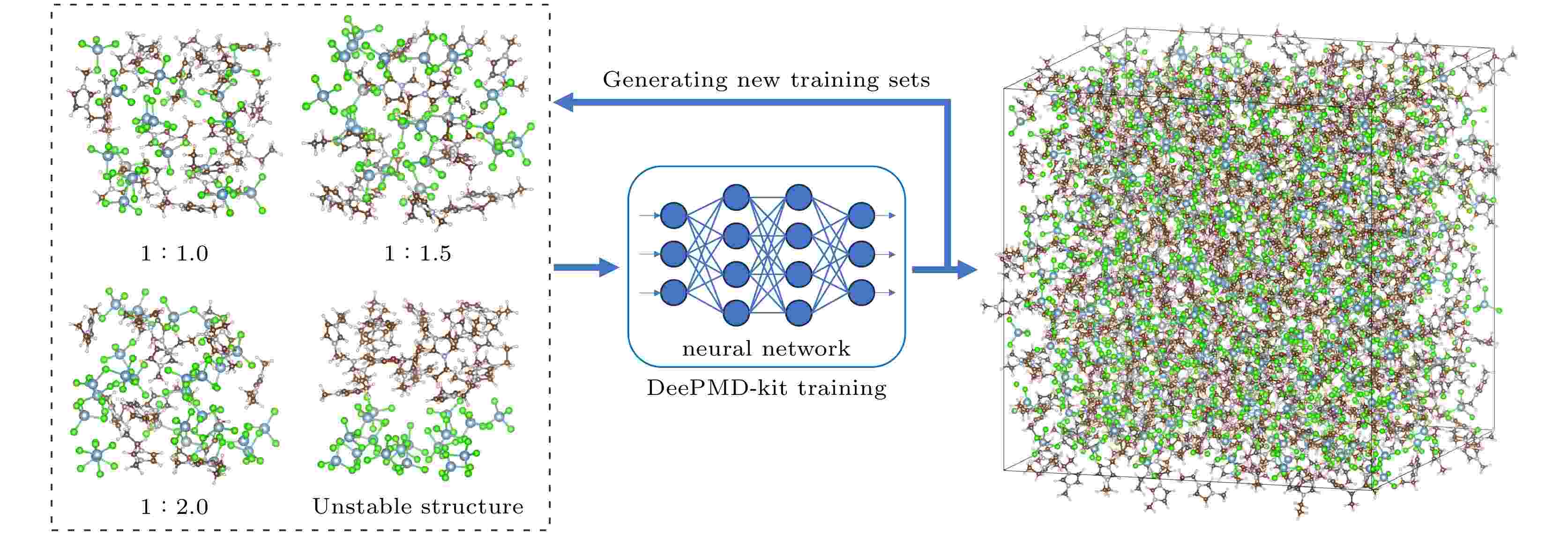 [EMIm]+Cl–+AlCl3离子液体是一种在铝离子电池中具有突出应用前景的电解液. 由于该离子液体中存在的可迁移离子种类多样(Al3+, AlCl3, [AlCl4]–和[Al2Cl7]–), 而且迁移离子类型之间存在实验研究尚未完全明晰的转换反应过程, 这导致其离子迁移机制复杂且离子扩散动力学过程缓慢, 难以通过常规的基于第一性原理分子动力学的方法实现具有显著统计意义的扩散动力学过程模拟. 本文建立了不同浓度的[EMIm]+Cl–+AlCl3离子液体原子尺度结构模型, 并基于第一性原理分子动力学模拟和主动学习方法构建了训练集和测试集, 实现了高精度的深度学习神经网络原子间势函数的拟合, 其拟合能量和原子受力误差分别为5×10–4 eV/atom和5×10–2 eV/Å. 进一步通过比较深度学习势与第一性原理分子动力学模拟计算得到的[EMIm]+Cl–+AlCl3离子液体径向分布函数和振动谱密度函数, 佐证了机器学习势进行分子动力学计算的可靠性. 最后, 基于深度学习势函数的分子动力学开展了针对包含上万原子体系不同浓度比例的[EMIm]+Cl–+AlCl3离子液体纳秒级别的扩散动力性质的研究, 预测显示300 K下该系列离子液体中Al3+扩散系数基本保持在4×10–7 cm2/s. 基于深度学习势分子动力学轨迹明确了Al3+的两种主要扩散机制: 其一为[AlCl4]–和[Al2Cl7]–在不同溶剂壳层结构的迁移机制; 其二为AlCl3分子通过电解液中[Al2Cl7]–与 [AlCl4]–之间传递AlCl3互相转换实现长程输运的过程. 本文对Al离子电池离子液体电解液的Al3+传输机理进行了更加深入的阐释, 并进一步推动了机器学习势在模拟具有复杂分子结构和扩散动力学反应机制的电解液领域应用.