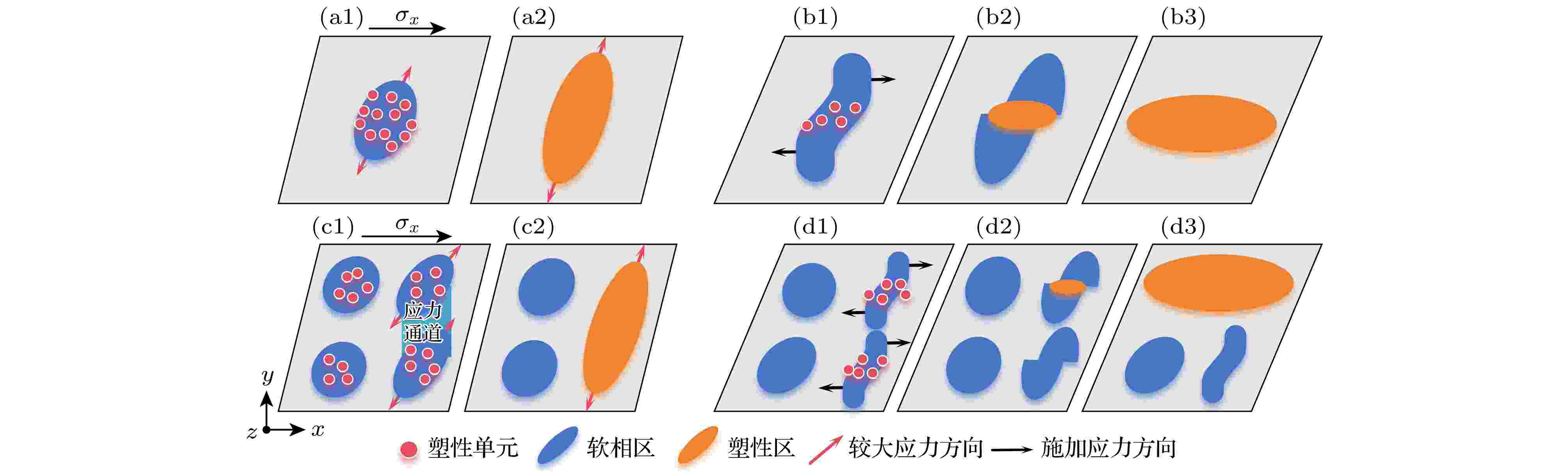 金属玻璃(MGs)的剪切带行为与其微观结构不均匀性密切相关. 传统分子动力学(MD)模拟因超快冷却速率导致MGs结构保留了更多液体特征, 而交换原子的蒙特卡罗(SMC)方法能够在模拟上制备出可匹配实验室时间冷却速度的低能态金属玻璃. 本文通过SMC结合MD方法, 构建软硬相分布可控的Cu50Zr50金属玻璃样品, 揭示纳米尺度结构不均匀性对剪切带萌生与扩展的调控机制. 由MD制备的软相中二十面体有序团簇含量较少, 优先激活塑性事件, 促进应力重新分布, 与邻近硬相一起响应对剪切带扩展起协同作用. MC制备的硬相区由于其高密度的二十面体团簇的含量, 使得应力局域集中, 形成窄剪切带. 通过调控硬相体积分数, 复合样品发生由韧到脆转变. 此外, 在保持硬相百分比不变的前提下, 不同序构策略可以改变非晶的力学行为: 离散硬相的分布能够增加样品的稳定性, 推迟剪切带的产生; 硬相包围软相的策略能够促进样品中产生二次剪切带, 使得剪切带区域相对非局域化. 该研究结果揭示了软硬区结构不均匀性对非晶合金力学性能的影响, 为采用序构方法设计金属玻璃力学性能提供了可能的理论指导.