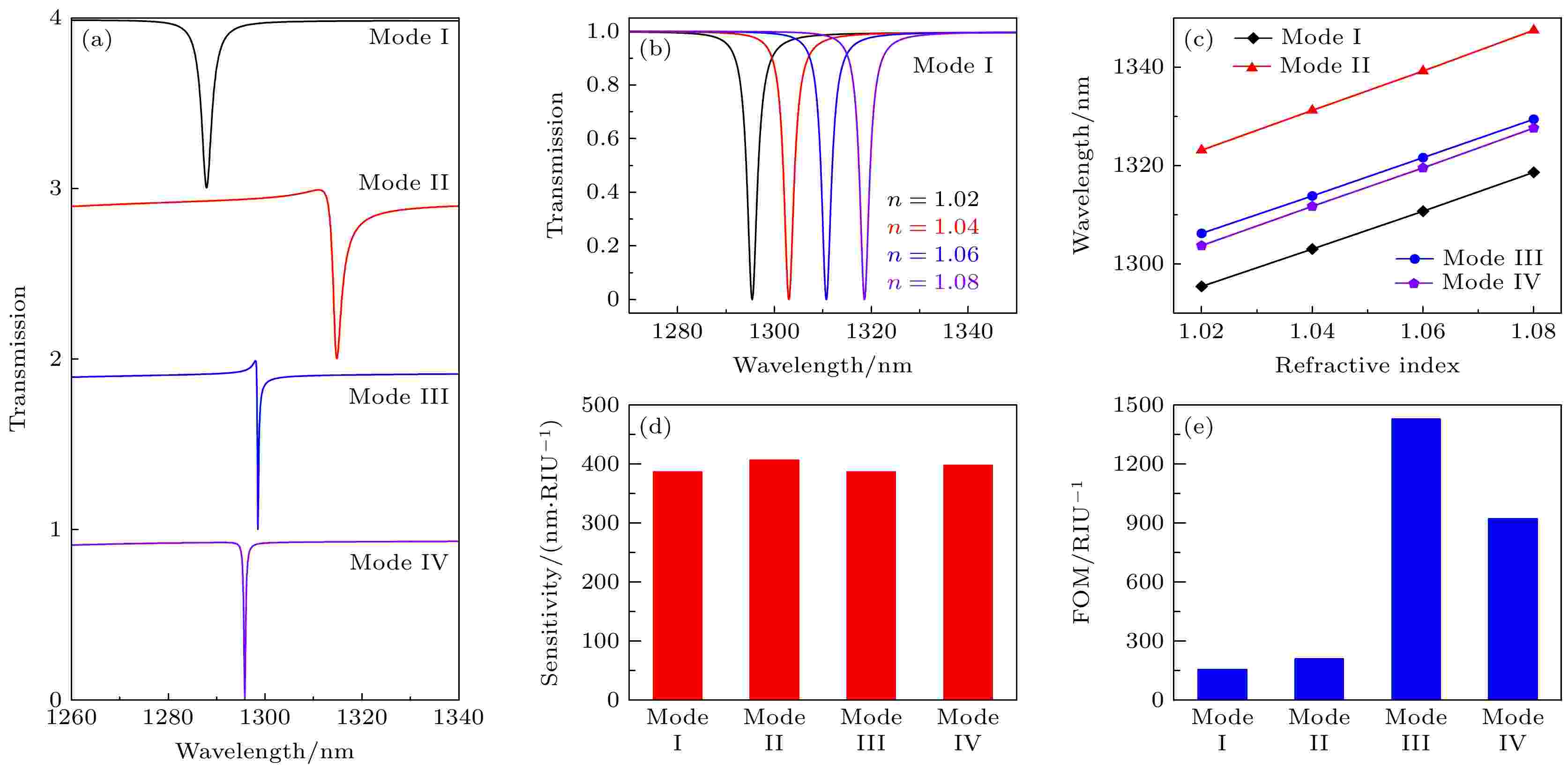 基于连续域束缚态(bound states in the continuum, BIC)的全介质超表面因其具有超高品质因子(quality factor, Q), 能有效地增强光与物质的相互作用, 而被广泛应用于微纳生物传感领域. 本文提出了一种基于BIC的矩形全介质双聚体超表面, 并采用有限元方法进行仿真模拟以及使用时域耦合模进行理论分析. 针对超表面中两长方对的角度、折射率、宽度和高度等参数, 分别设计了4种系统破缺方式, 均实现了对称保护型BIC (symmetry-protected BIC, SP-BIC)向准BIC (quasi-BIC, QBIC)模式的转变, 获得的最大Q因子高达1.75×104. 引入相同的不对称参数后, 4种调控方式下的超表面灵敏度几乎处于同一水平, 而传感品质因数(figure of merit, FOM)的差异可达103数量级. 在同一调控方式下, 当破缺参数绝对值相等时, 正向破缺的超表面的灵敏度和FOM都高于负向破缺. 经优化调节后, 超表面的灵敏度和FOM分别达到了395 nm/RIU和3502 RIU–1, 其综合性能指标已优于大部分现有研究. 该超表面为生物、医疗领域的传感检测提供了有效手段, 同时该研究为基于BIC的折射率传感器的设计提供了新思路.