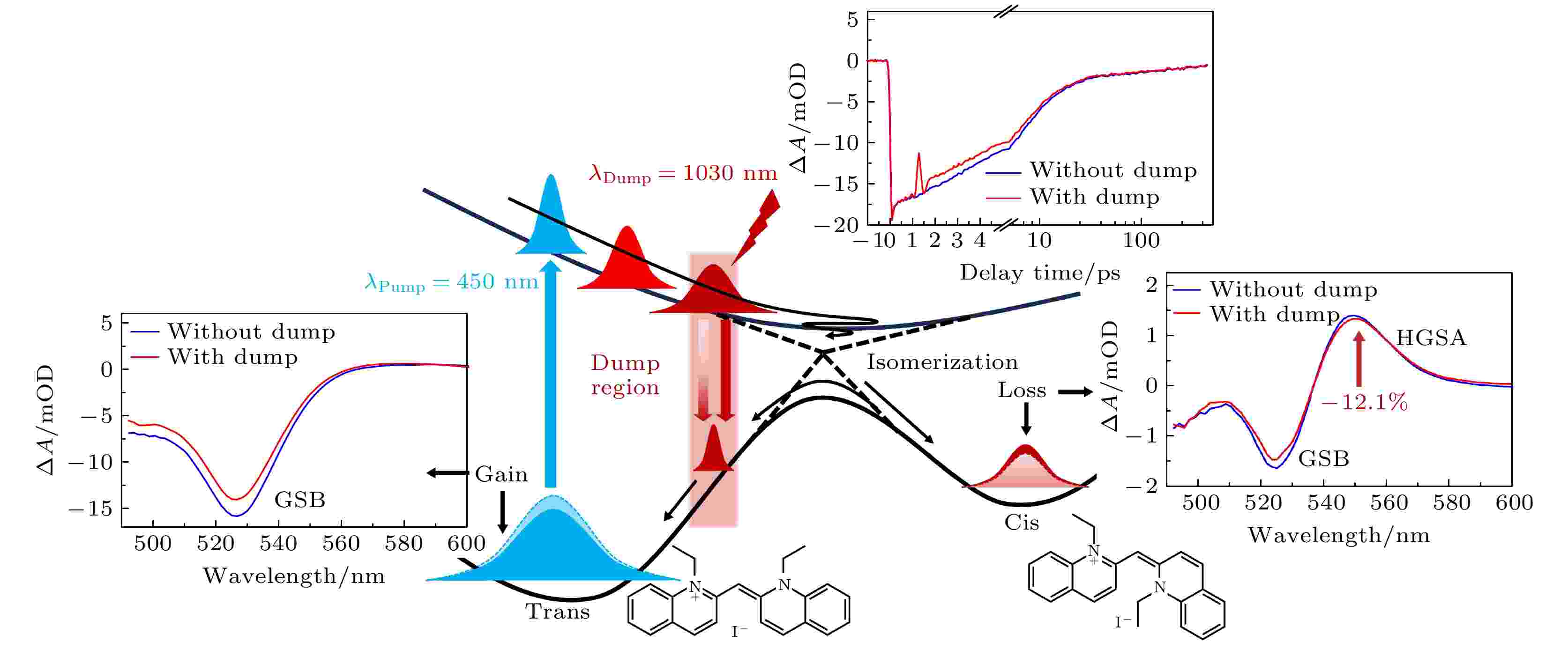 光致异构化是分子光物理与光化学反应的核心, 其量子产率与激发态动力学演化路径相关. 改变分子激发态演化路径以实现对光化学反应的精准操控是物理学家、化学家长期以来追求的梦想. 本文采用飞秒泵浦-受激亏蚀-探测(pump-dump-probe)光谱技术, 研究了受激亏蚀光脉冲对1, 1'-二乙基-2, 2'-碘化菁(1, 1'-diethyl-2, 2'-cyanine iodide, 1122C)分子光异构化动力学的影响. 在泵浦-探测(pump-probe)实验中, 1122C分子被泵浦光激发之后, 处于激发态的分子以5.6 ps的时间常数沿扭转反应坐标发生结构变化, 从反式(trans-)构型转变为顺式(cis-)构型. 为了对该反应进行人为调控, 本文在传统泵浦-探测光谱的基础上, 引入第3束波长为1030 nm的飞秒受激亏蚀光. 受激亏蚀光脉冲成功使部分处于激发态的反式构型分子通过受激跃迁直接返回基态, 绕过了原本通向顺式产物的异构化通道. 通过比较顺式产物吸收信号的变化, 计算得出受激亏蚀光作用下顺式构型的产率降低了约12.1%. 本文研究实现了利用飞秒激光对超快光化学反应路径的主动干预, 展示了飞秒多脉冲光谱技术在调控分子激发态演化路径、优化光异构化反应产率的潜力. 该研究为将来对复杂光化学反应精准操控提供了理论和技术支持.