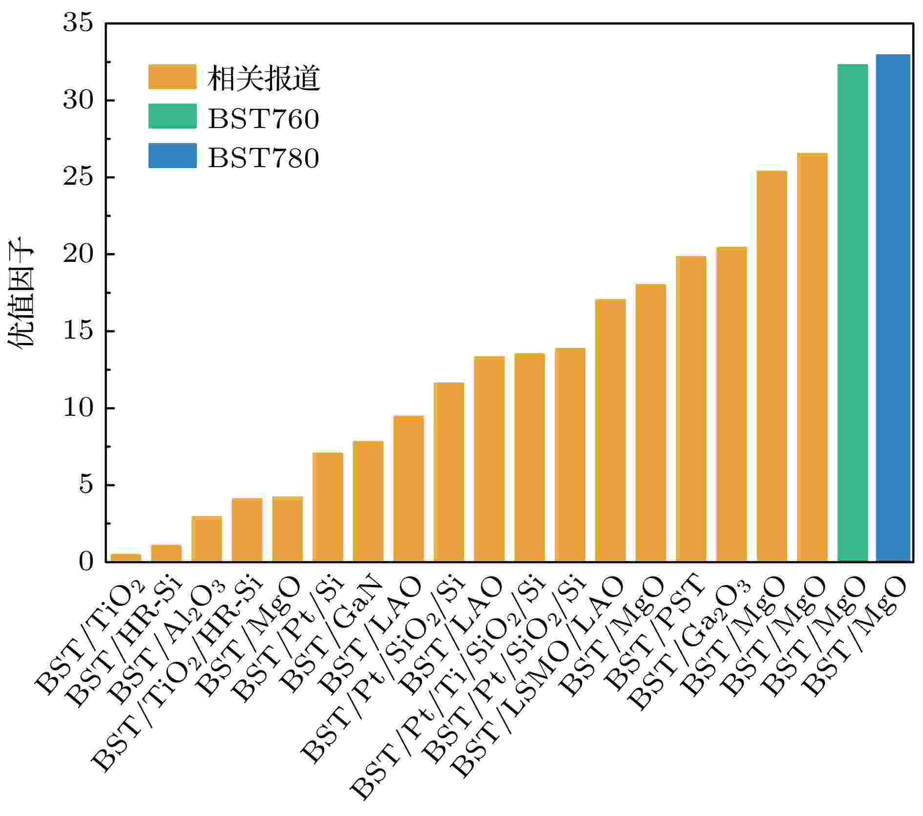 微波可调器件是相控阵天线和射频前端的重要组成部分, 对于实现频率、相位和幅度的精准控制至关重要. 电介质陶瓷块体材料在微波可调器件中应用广泛, 但不易集成. 电介质薄膜材料具有易集成、低成本、高调谐速率、低功耗、小尺寸、连续可调等优点, 且相比块体材料更易与现代集成电路工艺兼容. 目前, 基于电介质薄膜材料设计器件的前提是: 在提高薄膜结晶质量的同时, 需采用低介电常数和低损耗的材料作为衬底来降低其对整体介电性能的影响. 然而, 适合电介质薄膜外延生长的低介电低损耗衬底(如MgO, Si等)与电介质薄膜晶格失配较大(>5%), 造成高质量外延生长面临较大挑战, 导致难以厘清其本征构效关系, 阻碍了其性能的协同优化, 进而无法获得高可调低损耗的电介质薄膜材料. 因此, 本研究基于激光脉冲沉积技术, 利用畴匹配外延机制在MgO(001)衬底上制备出了高性能的Ba0.6Sr0.4TiO3外延薄膜, 其可调率达到67.2%, 品质因子为49, 优值因子为32.93. 与已有报道相比, 本研究制备的Ba0.6Sr0.4TiO3薄膜表现出更高的介电可调率和更低的介电损耗, 系统地分析了薄膜形貌、晶体结构、温度等因素对其介电性能的影响, 为厘清Ba1–xSrxTiO3薄膜的宽频域构效关系奠定了基础, 凸显了其在可调谐微波器件中的应用潜力.