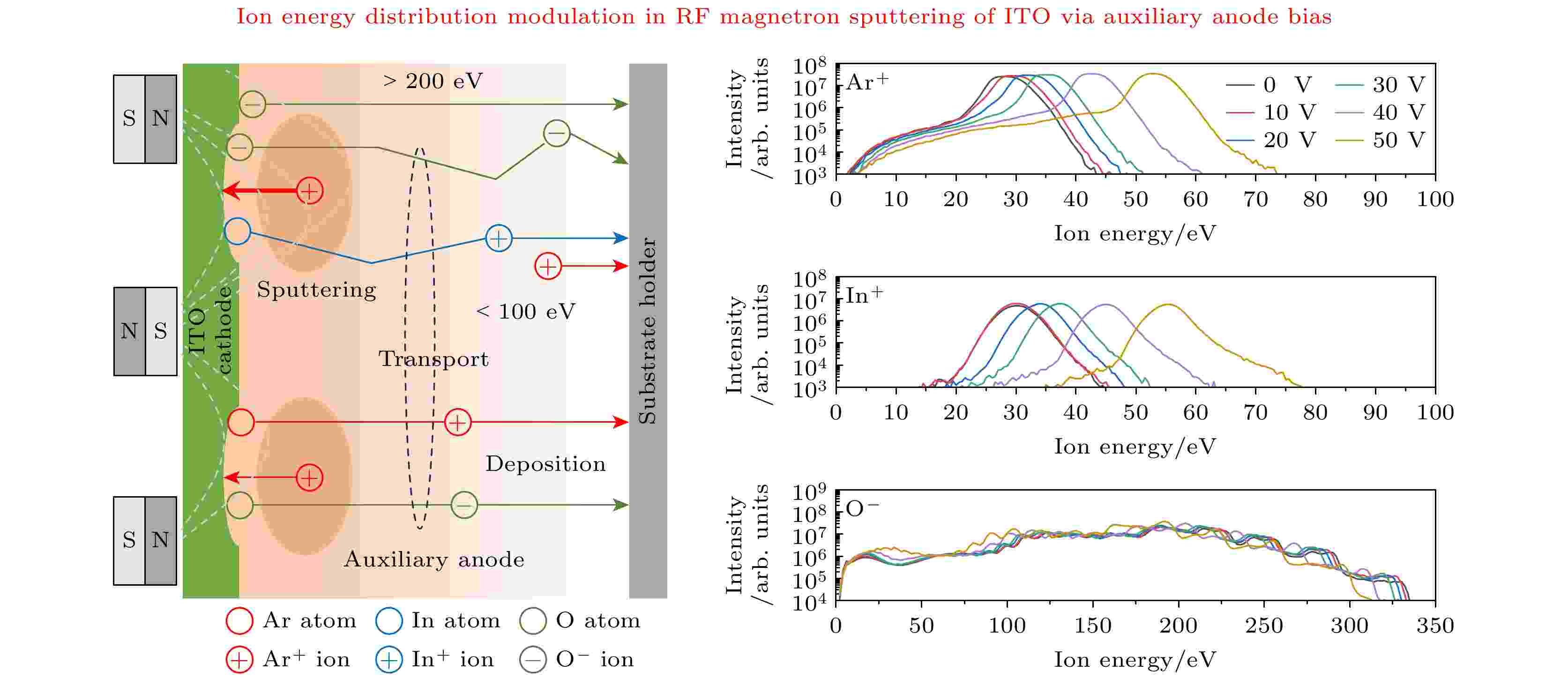 磁控溅射沉积透明导电氧化物薄膜过程中, 理解离子动力学过程是揭示“溅射损伤”机理并发展损伤抑制策略的关键. 本研究在纯Ar气氛下, 以氧化铟锡为阴极靶材, 系统探讨辅助阳极正偏压对射频磁控放电中基底入射离子能量分布的影响. 结果表明, 入射正离子包括O+, Ar+, In+, Sn+及多种金属氧化物分子离子和双电荷离子, 其能量由溅射原子的初始逸出能与等离子体电势共同决定, 并随辅助阳极偏压的升高而增强. 负离子源于阴极溅射, 其中O–和$\rm O_2^-$负离子能量分布宽广且呈多峰结构, 与阴极电压、等离子体电势的射频振荡及离子输运的弛豫效应密切相关. 金属氧化物负离子(InO–, $\rm InO_2^-$, SnO–和$\rm SnO_2^-$)对射频鞘响应滞后, 其高能峰向阴极偏置电压收敛. 高能负离子是导致“溅射损伤”的主要原因, 施加辅助阳极正偏压能有效降低其能量, 为透明导电氧化物薄膜损伤抑制提供潜在解决方案.