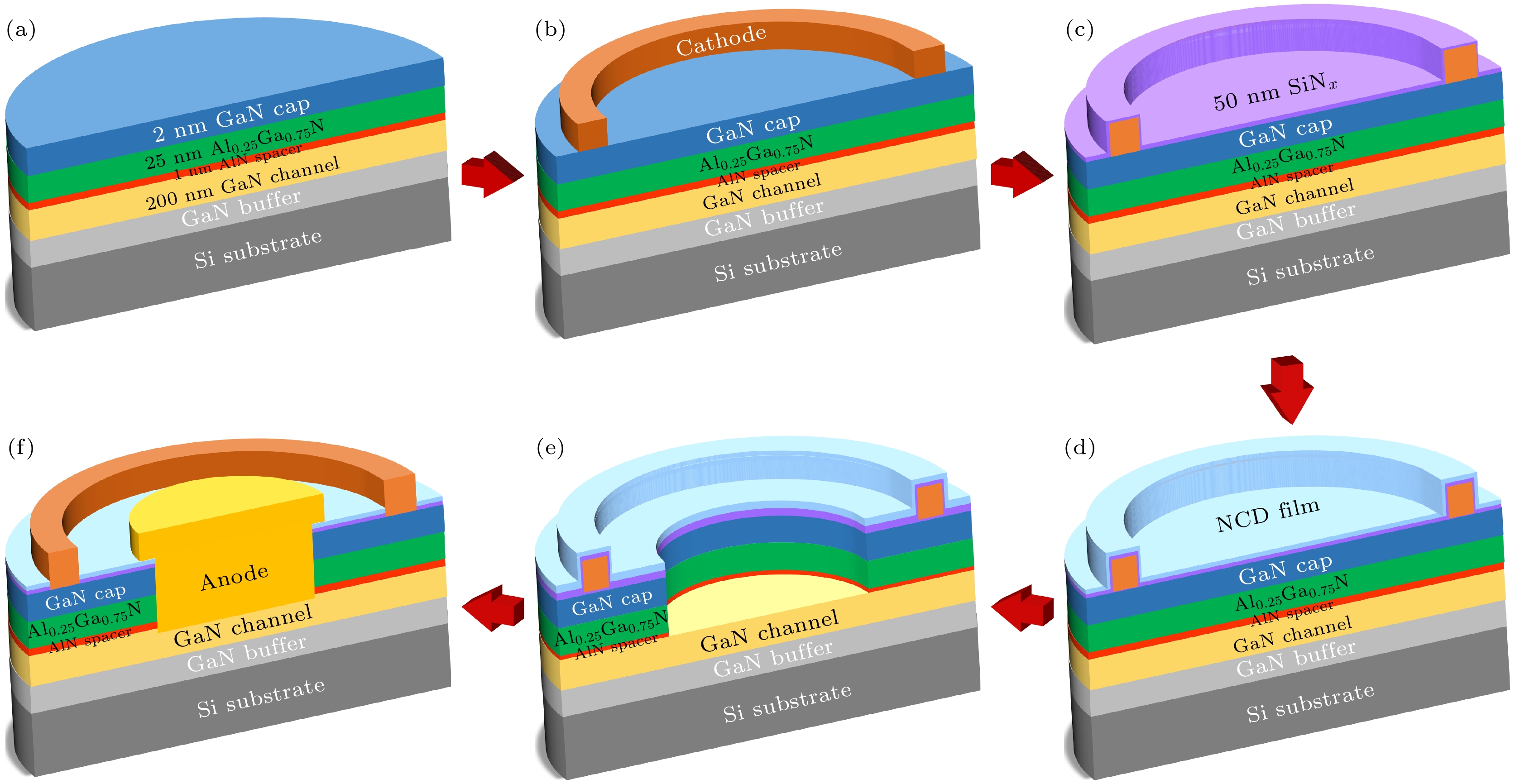 图 2 纳米晶金刚石钝化GaN基SBD主要工艺流程示意图 (a) 材料清洗与台面隔离; (b) 与欧姆阴极制作; (c) SiNx隔离层淀积; (d) 纳米晶金刚石薄膜生长; (e) 多步刻蚀暴露阳极区域; (f) 肖特基阳极制作与阴极开孔
