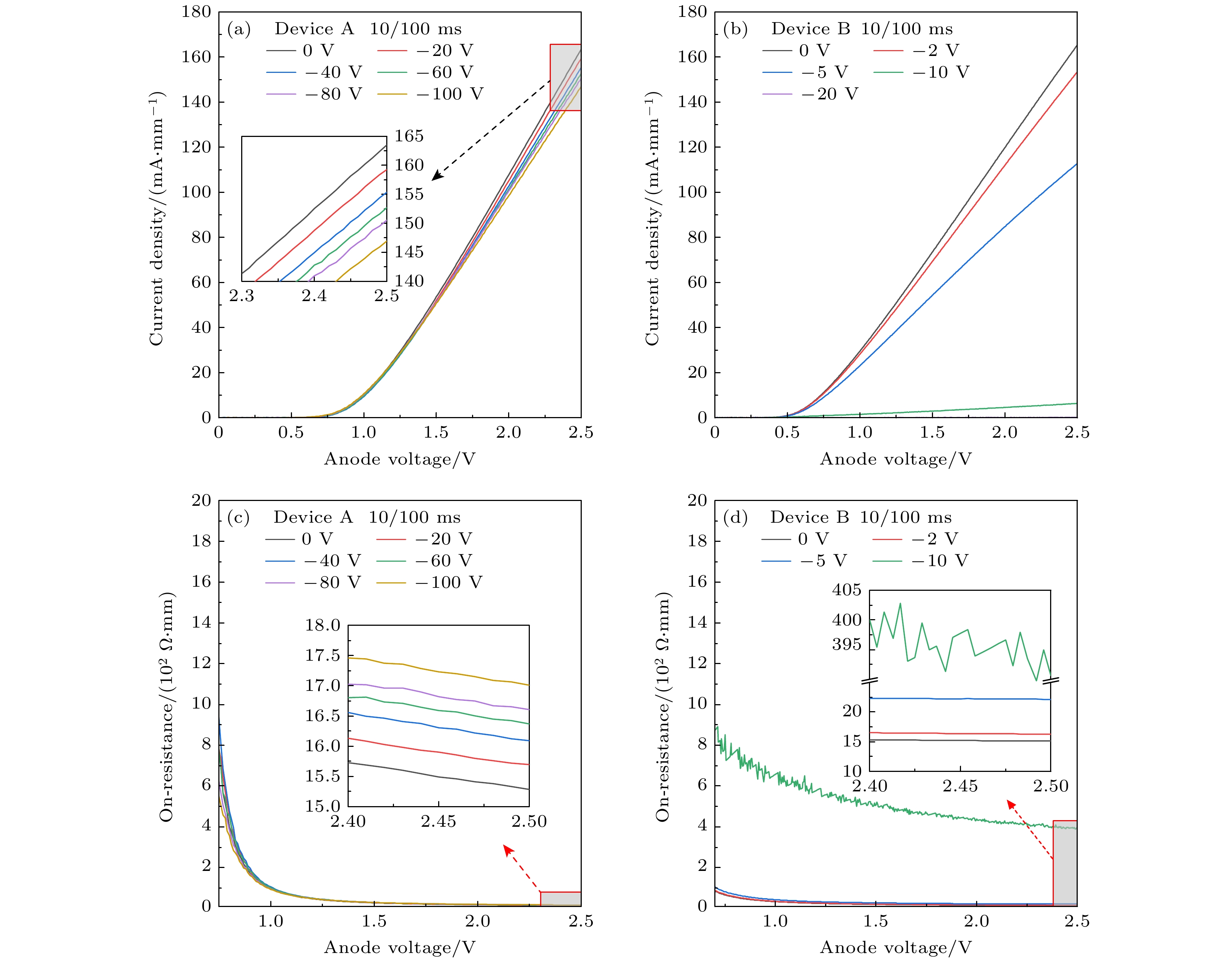 图 7 器件A和器件B的动态正向特性对比 (a) 器件A脉冲电流-电压特性; (b) 器件B脉冲电流-电压特性; (c) 器件A动态导通电阻特性; (d) 器件B动态导通电阻特性