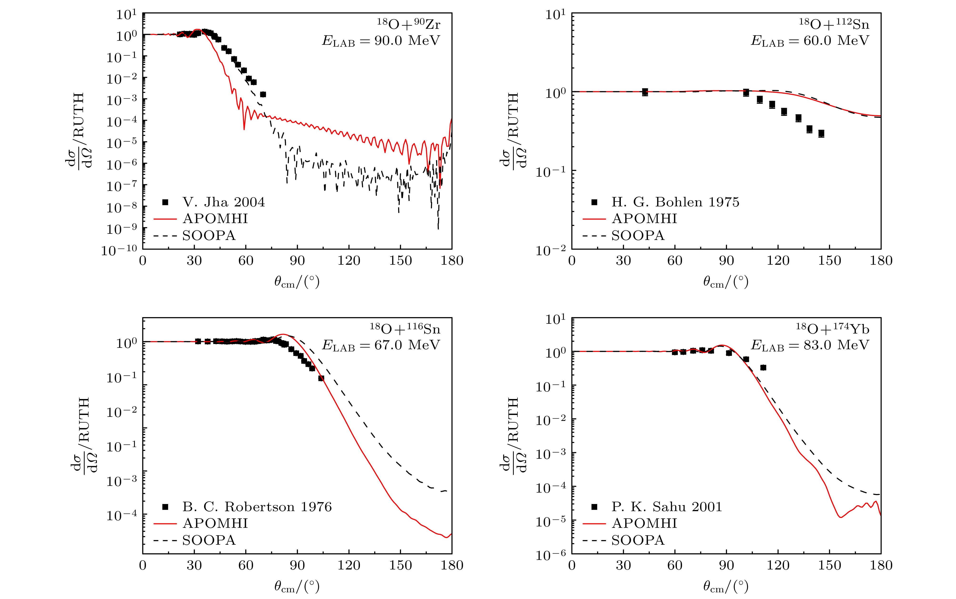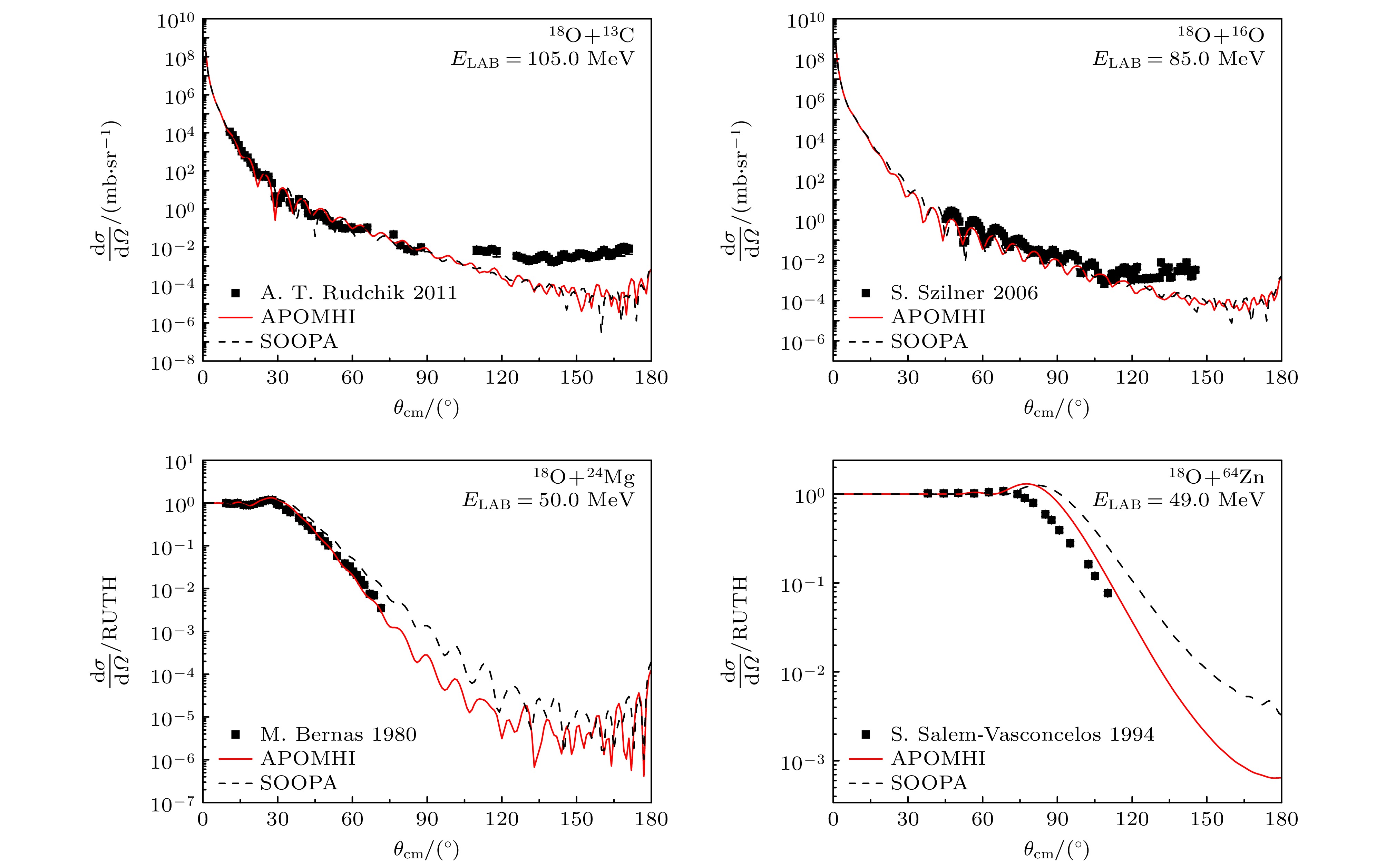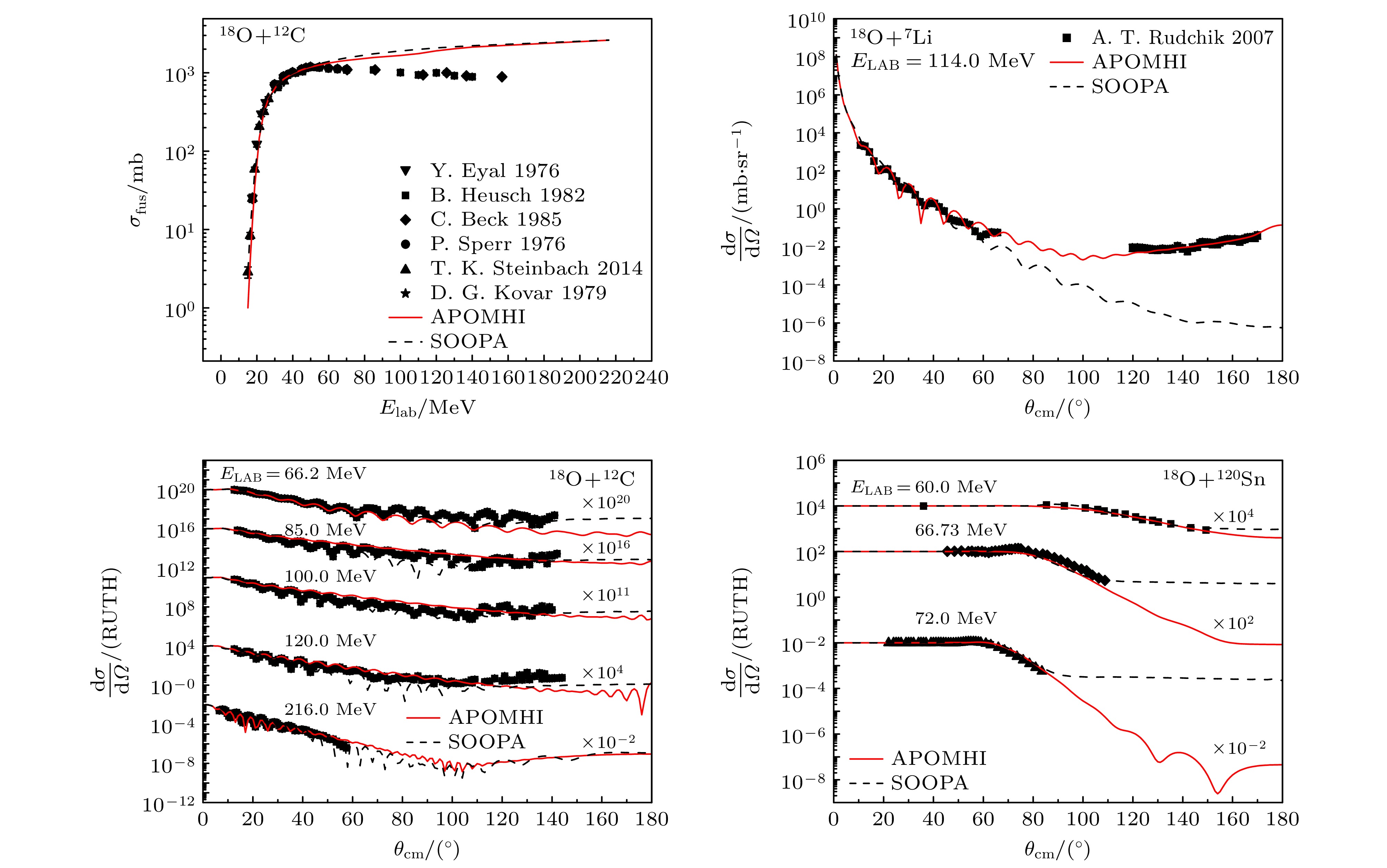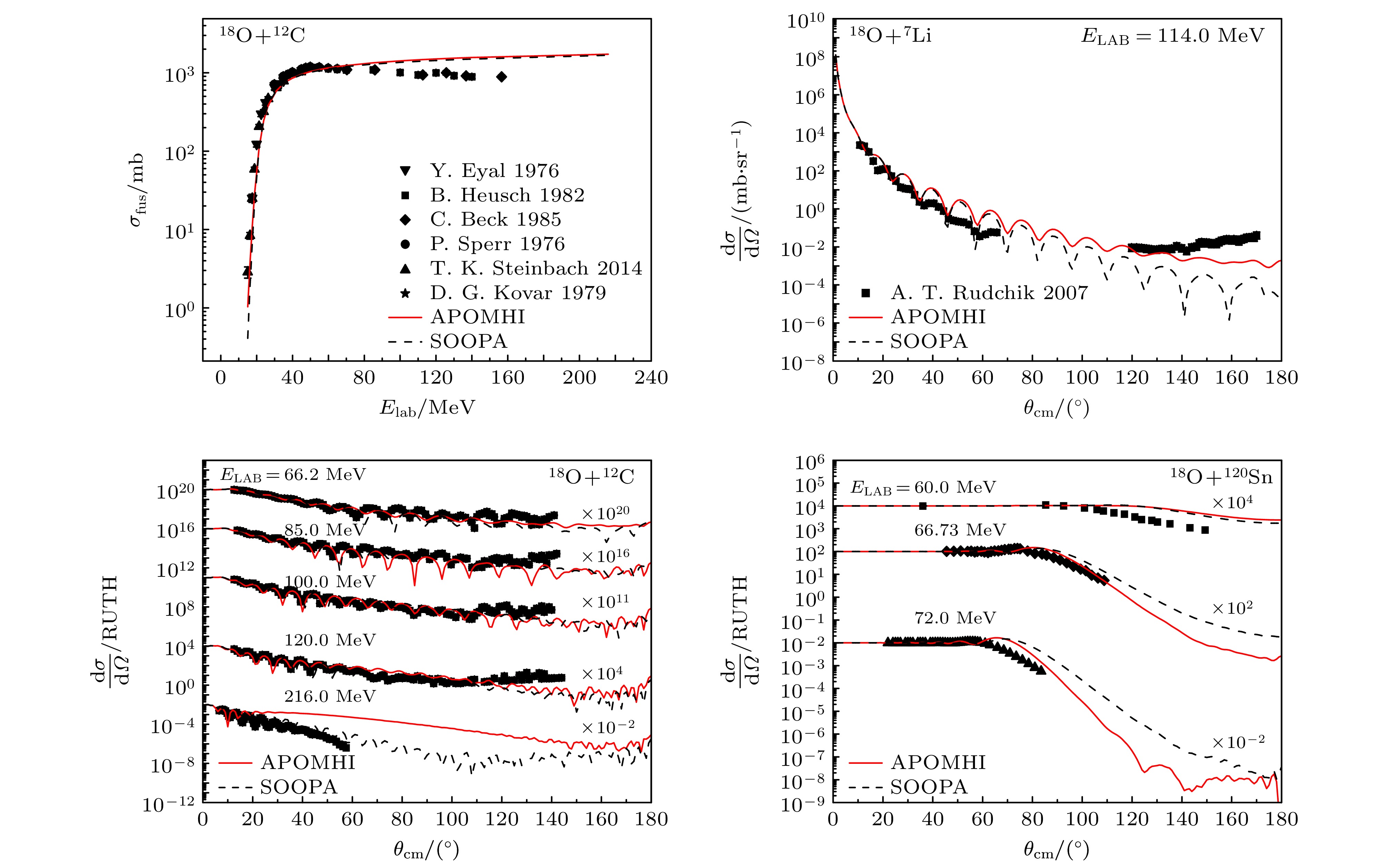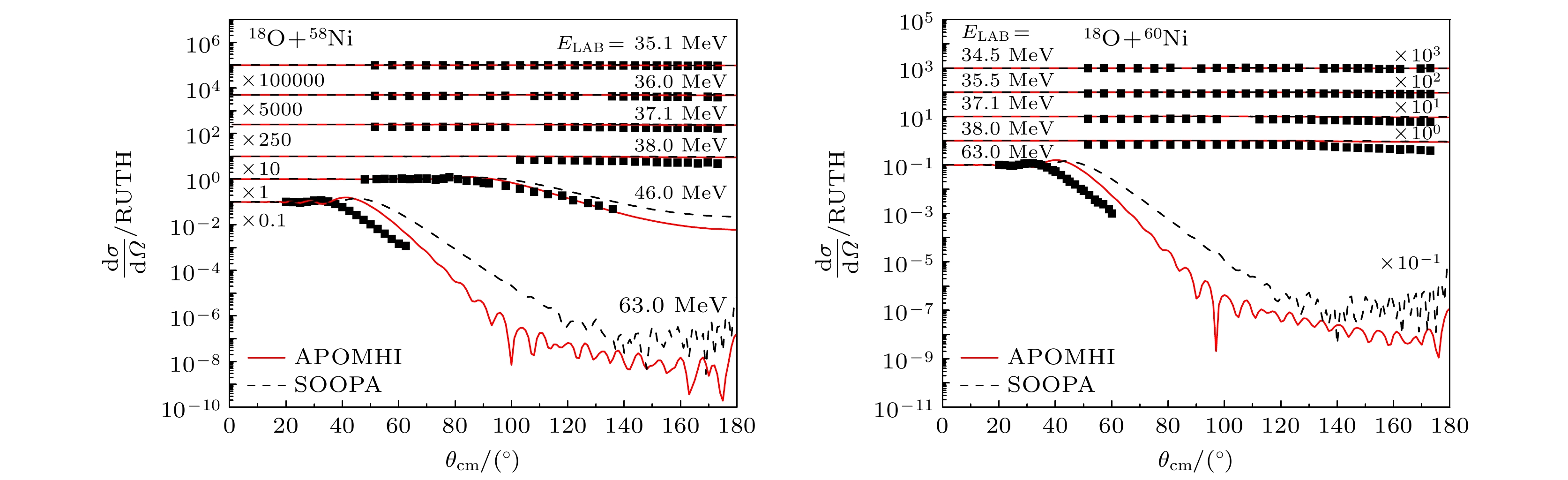 序号 靶核 熔合截面 弹性散射角分布 EL/MeV 文献 EL/MeV 文献 1 9Be 7.0—21.0 [31] 2 10B 22.0—63.0 [32] 3 11B 21.0—65.0 [32] 4 13C 105.0 [33] 5 16O 13.9—85.0 [34,35] 85.0 [36] 6 24Mg 32.0—72.0 [37] 50.0 [38] 7 27Al 28.0—72.0 [39,40] 8 28Si 34.0—72.0 [39] 9 44Ca 27.0—60.0 [41] 10 58Ni 35.0—64.0 [42,43] 35.1, 36.0, 37.1, 38.0, 46.0, 63.0 [44–46] 11 60Ni 40.0—63.0 [43] 34.5, 35.5, 37.1, 38.0, 63.0 [44,46] 12 64Ni 38.5—64.0 [43] 13 63Cu 40.0—65.0 [47] 14 65Cu 40.0—65.0 [47] 15 64Zn 49.0 [48] 16 74Ge 37.0—61.0 [49] 17 90Zr 90.0 [50] 18 92Mo 50.0—65.0 [51] 19 112Sn 60.0 [52] 20 116Sn 67.0 [53] 21 148Nd 61.8—77.0 [54] 22 150Sm 65.0—125.0 [55,56] 23 174Yb 83.0 [57] 24 188Os 80.0—140.0 [58] 25 192Os 79.0—124.0 [55,56] 26 194Pt 77.6—106.0 [59] 27 197Au 77.6—102.0 [60,61] 28 208Pb 75.0—102.0 [62] 29 7Li 114 [63] 30 12C 15.0—216 [64–69] 66.2, 85.0, 100.0, 120.0, 216.0 [70,71] 31 120Sn 60.0, 66.7, 72.0 [46,52,53] 32 14C 105.0 [72] 33 61Ni 33.5—52.6 [73] 表 4 18O作为弹核系列核反应APOMHI模型下普适光学势最佳参数