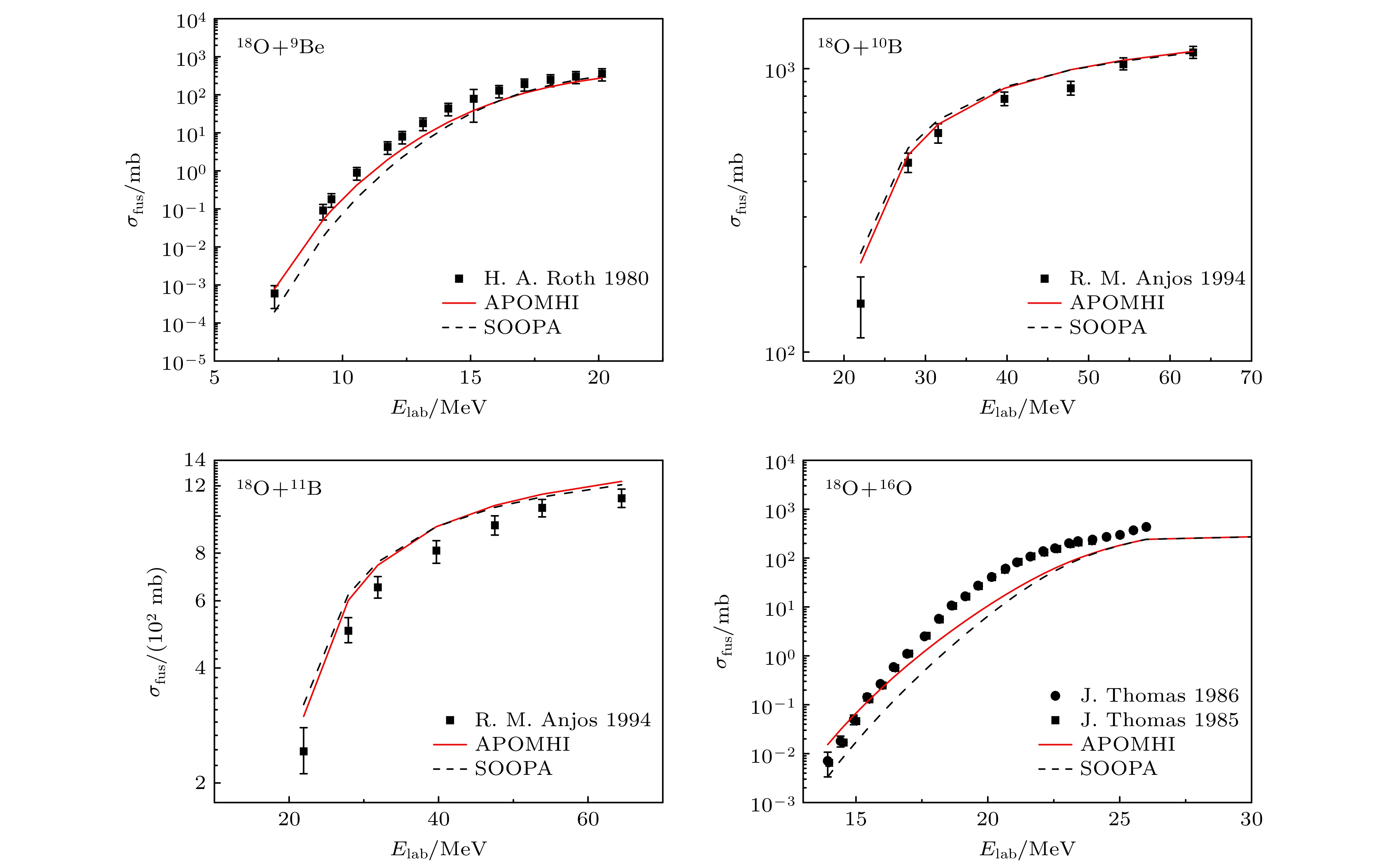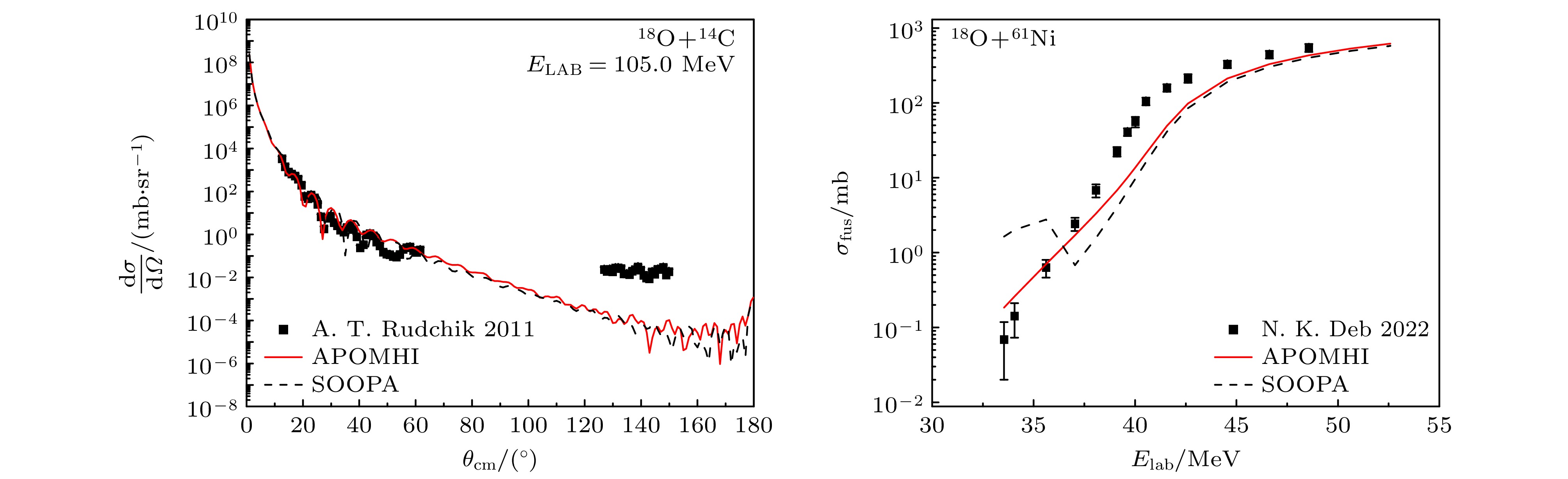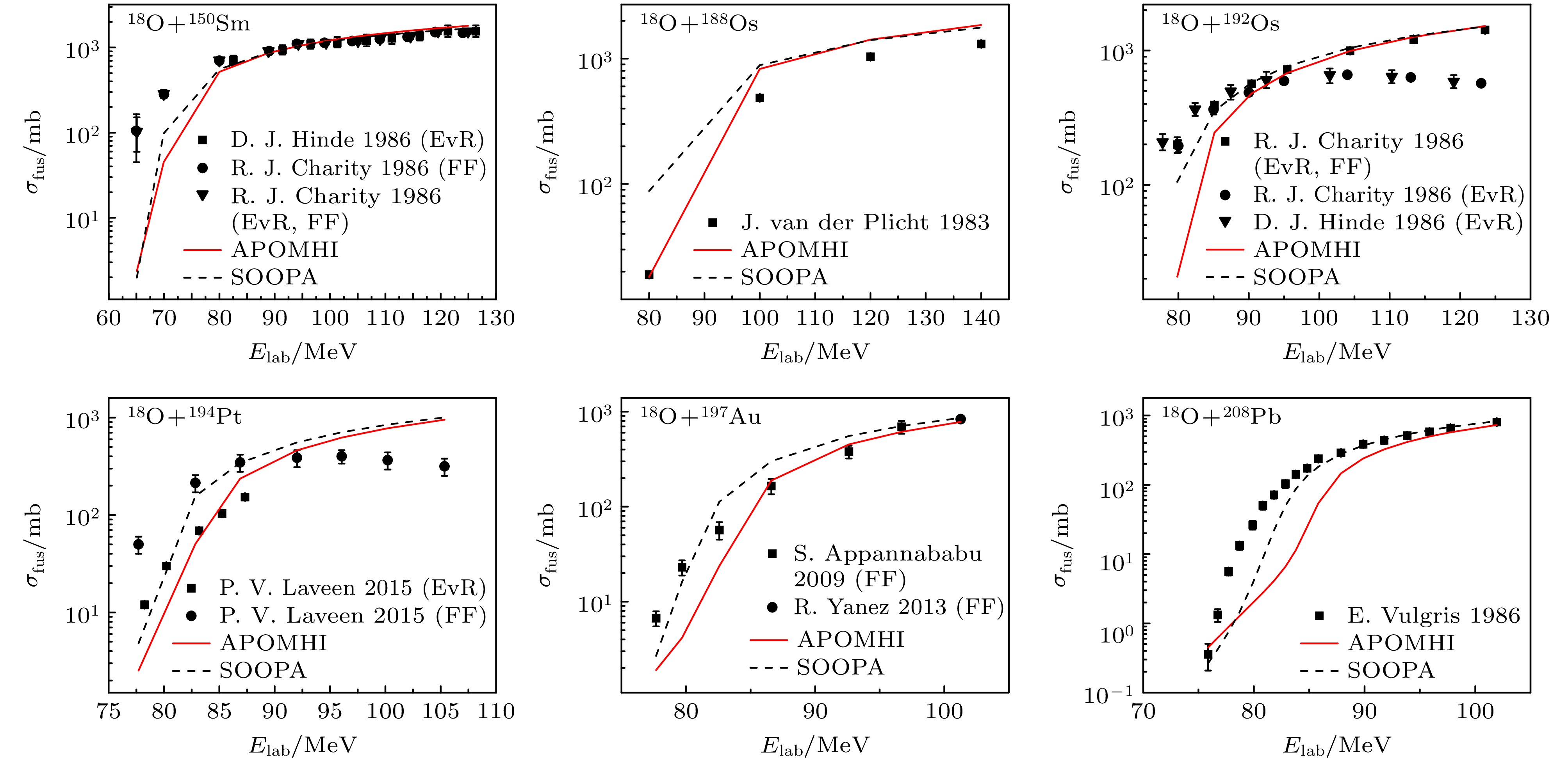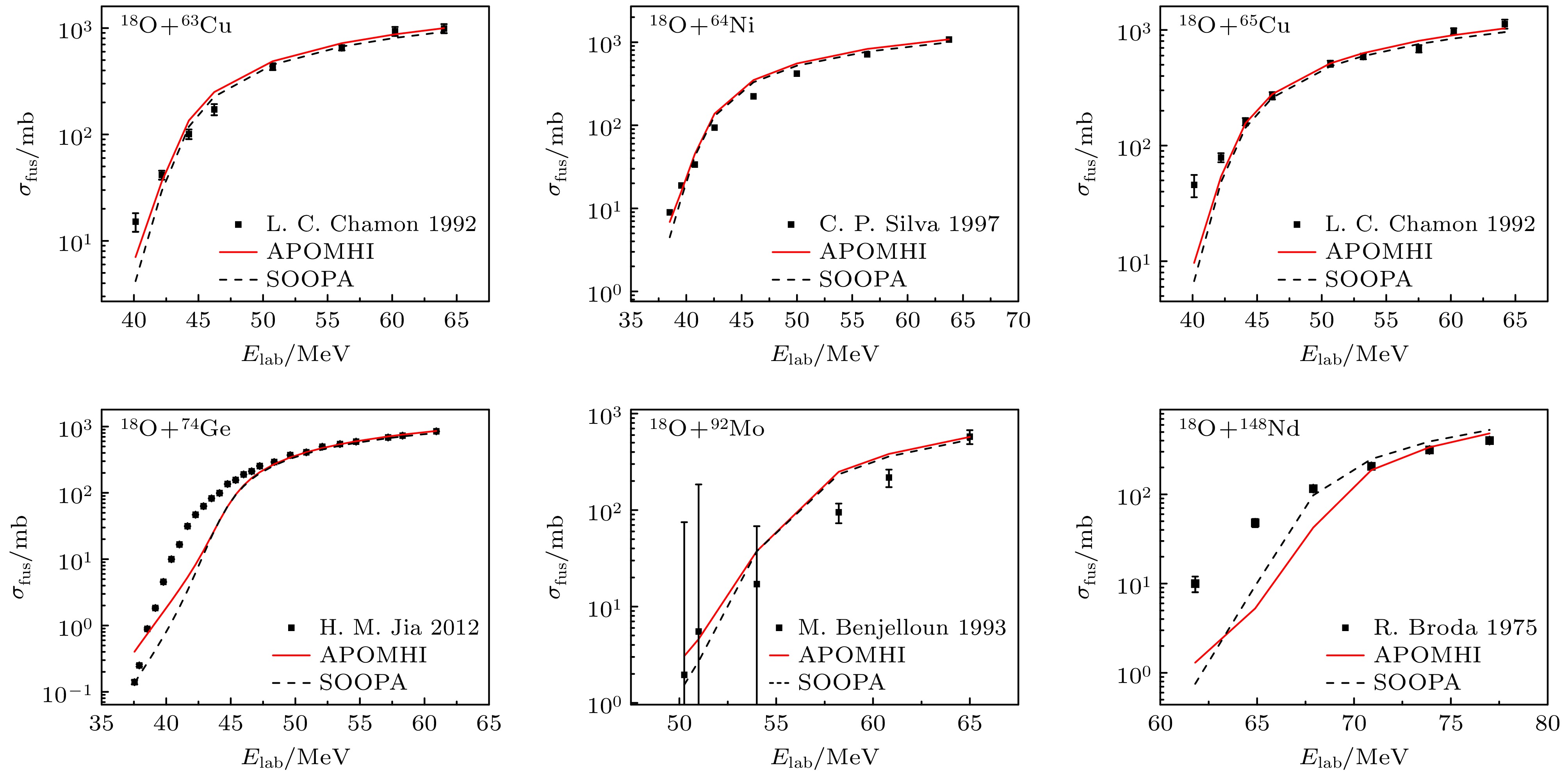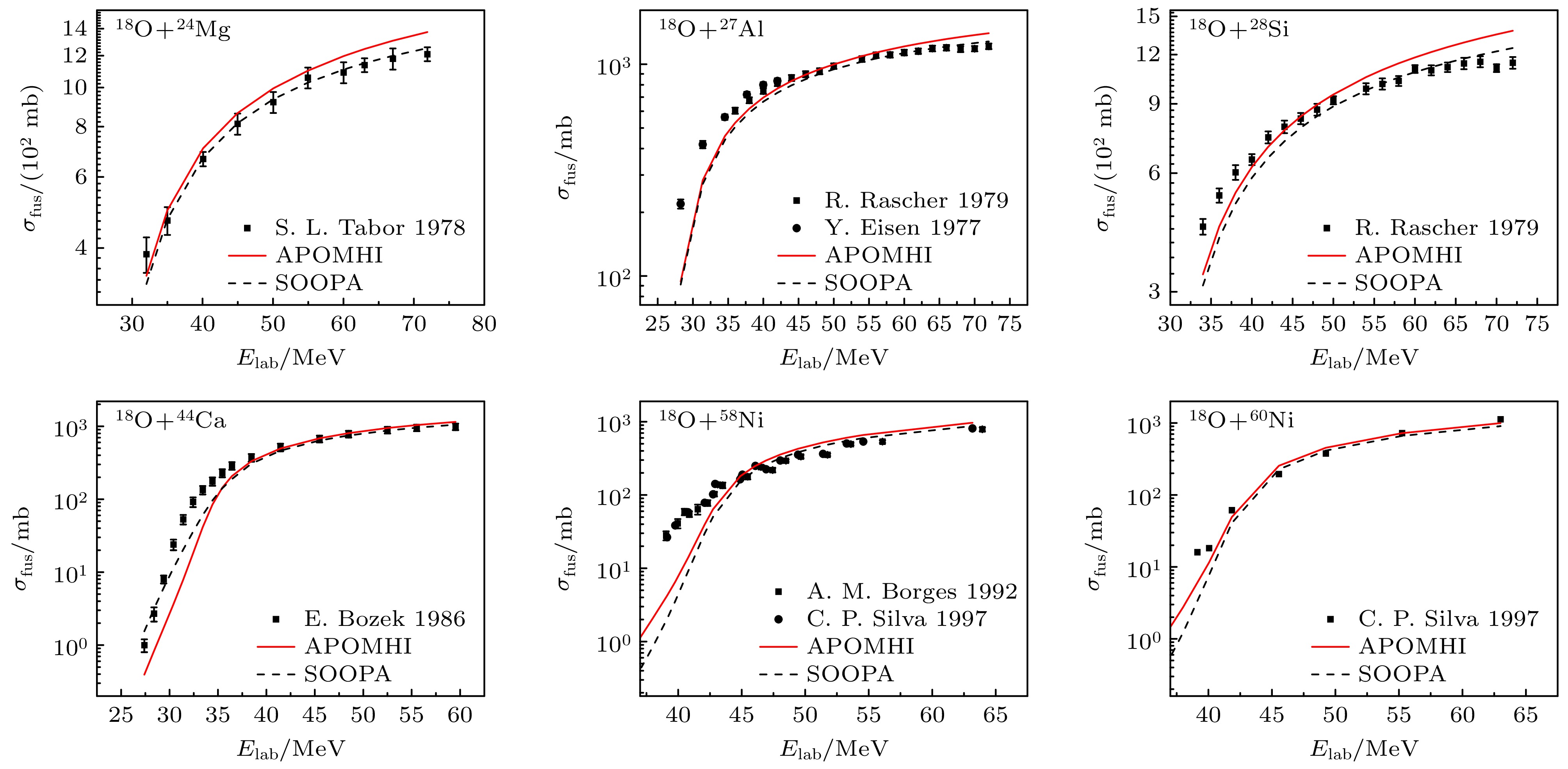 序号 靶核 熔合截面 弹性散射角分布 EL/MeV 文献 EL/MeV 文献 1 9Be 7.0—21.0 [31] 2 10B 22.0—63.0 [32] 3 11B 21.0—65.0 [32] 4 13C 105.0 [33] 5 16O 13.9—85.0 [34,35] 85.0 [36] 6 24Mg 32.0—72.0 [37] 50.0 [38] 7 27Al 28.0—72.0 [39,40] 8 28Si 34.0—72.0 [39] 9 44Ca 27.0—60.0 [41] 10 58Ni 35.0—64.0 [42,43] 35.1, 36.0, 37.1, 38.0, 46.0, 63.0 [44–46] 11 60Ni 40.0—63.0 [43] 34.5, 35.5, 37.1, 38.0, 63.0 [44,46] 12 64Ni 38.5—64.0 [43] 13 63Cu 40.0—65.0 [47] 14 65Cu 40.0—65.0 [47] 15 64Zn 49.0 [48] 16 74Ge 37.0—61.0 [49] 17 90Zr 90.0 [50] 18 92Mo 50.0—65.0 [51] 19 112Sn 60.0 [52] 20 116Sn 67.0 [53] 21 148Nd 61.8—77.0 [54] 22 150Sm 65.0—125.0 [55,56] 23 174Yb 83.0 [57] 24 188Os 80.0—140.0 [58] 25 192Os 79.0—124.0 [55,56] 26 194Pt 77.6—106.0 [59] 27 197Au 77.6—102.0 [60,61] 28 208Pb 75.0—102.0 [62] 29 7Li 114 [63] 30 12C 15.0—216 [64–69] 66.2, 85.0, 100.0, 120.0, 216.0 [70,71] 31 120Sn 60.0, 66.7, 72.0 [46,52,53] 32 14C 105.0 [72] 33 61Ni 33.5—52.6 [73] 表 4 18O作为弹核系列核反应APOMHI模型下普适光学势最佳参数