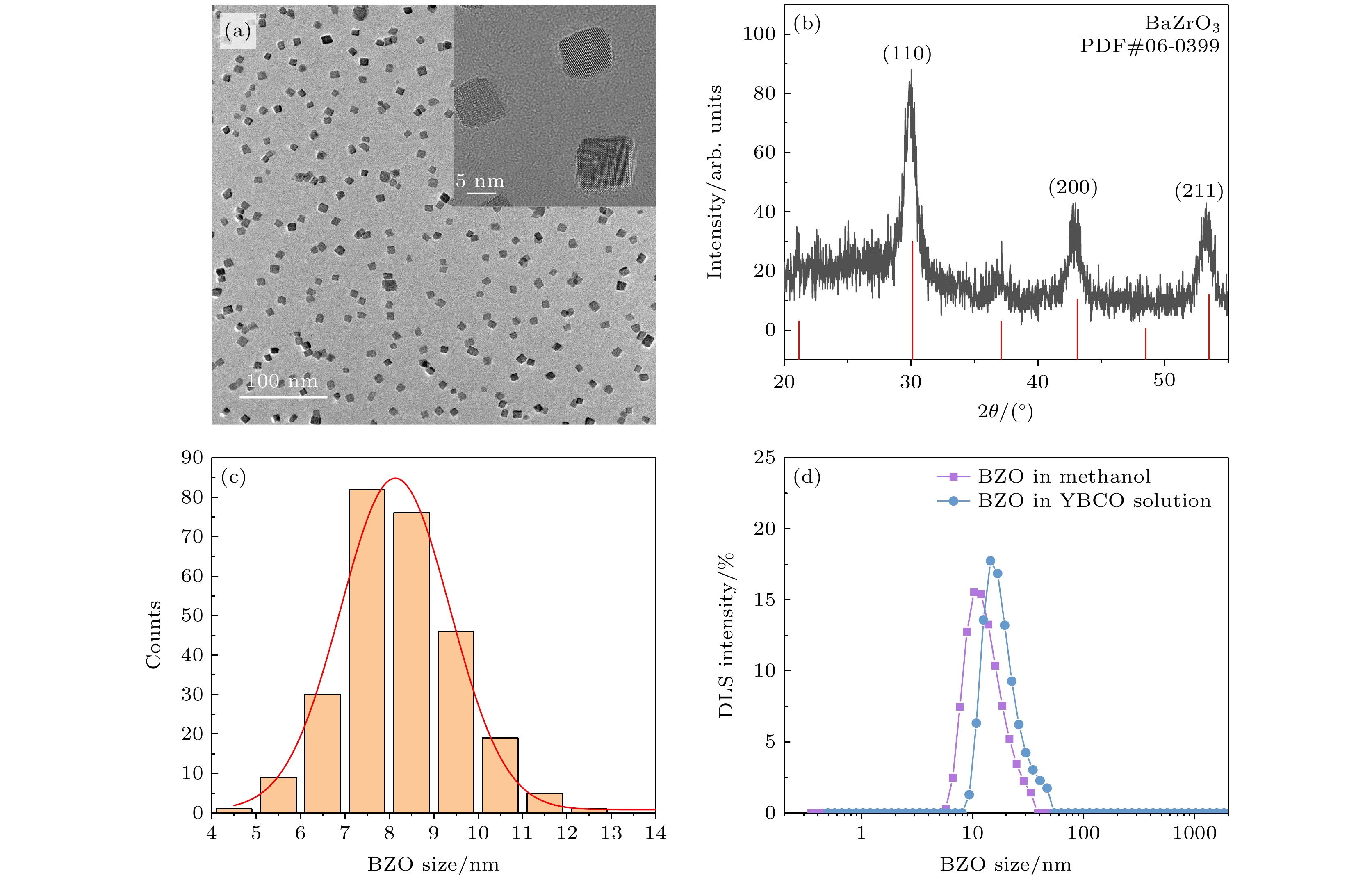图 1 (a) BZO纳米晶的TEM图像; (b) XRD图谱; (c) 平均粒径为(8 ± 2) nm的粒径分布曲线; (d) BZO纳米晶在乙醇和YBCO前驱体溶液中的动态光散射(DLS)粒径分布曲线