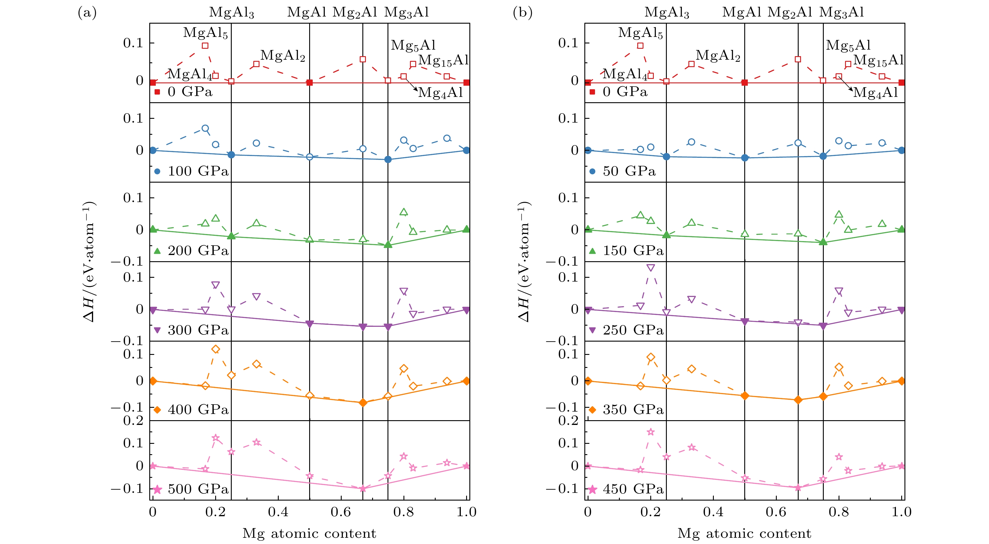 图 3 (a) MgAl3的P63/mmc相对于Pm-3m相在0—500 GPa范围内的焓差曲线; (b) MgAl的Pmmb相和Fd-3m相对于P4/mmm相在0—500 GPa范围内的焓差曲线; (c) Mg3Al的Fm-3m相对于P63/mmc相在0—500 GPa范围内的焓差曲线