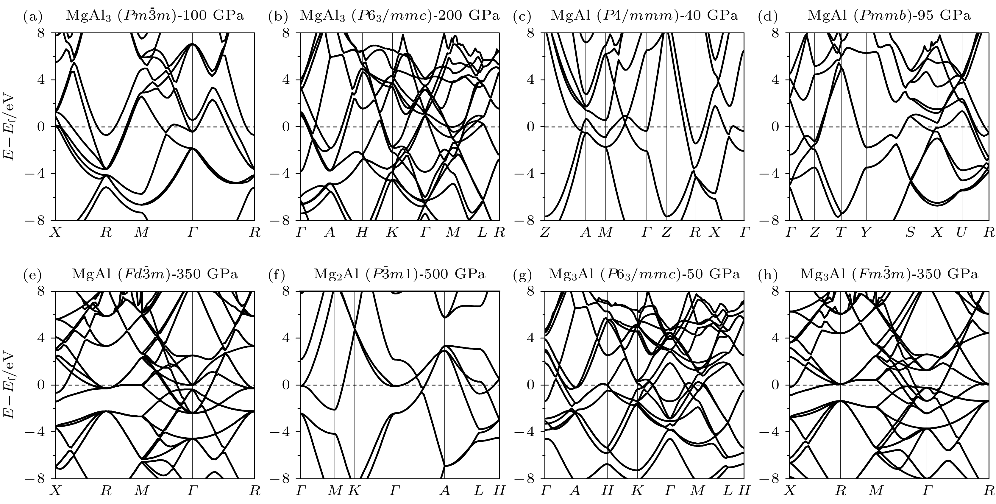 图 10 稳定的 MgmAln化合物的能带图 (a) 100 GPa的MgAl3-Pm-3m结构; (b) 200 GPa的MgAl3-P63/mmc结构; (c) 40 GPa的MgAl-P4/mmm结构; (d) 95 GPa的MgAl-Pmmb结构; (e) 350 GPa的MgAl-Fd-3m结构; (f) 500 GPa的Mg2Al-P-3m1结构; (g) 50 GPa的Mg3Al-P63/mmc结构; (h) 350 GPa的Mg3Al-Fm-3m结构