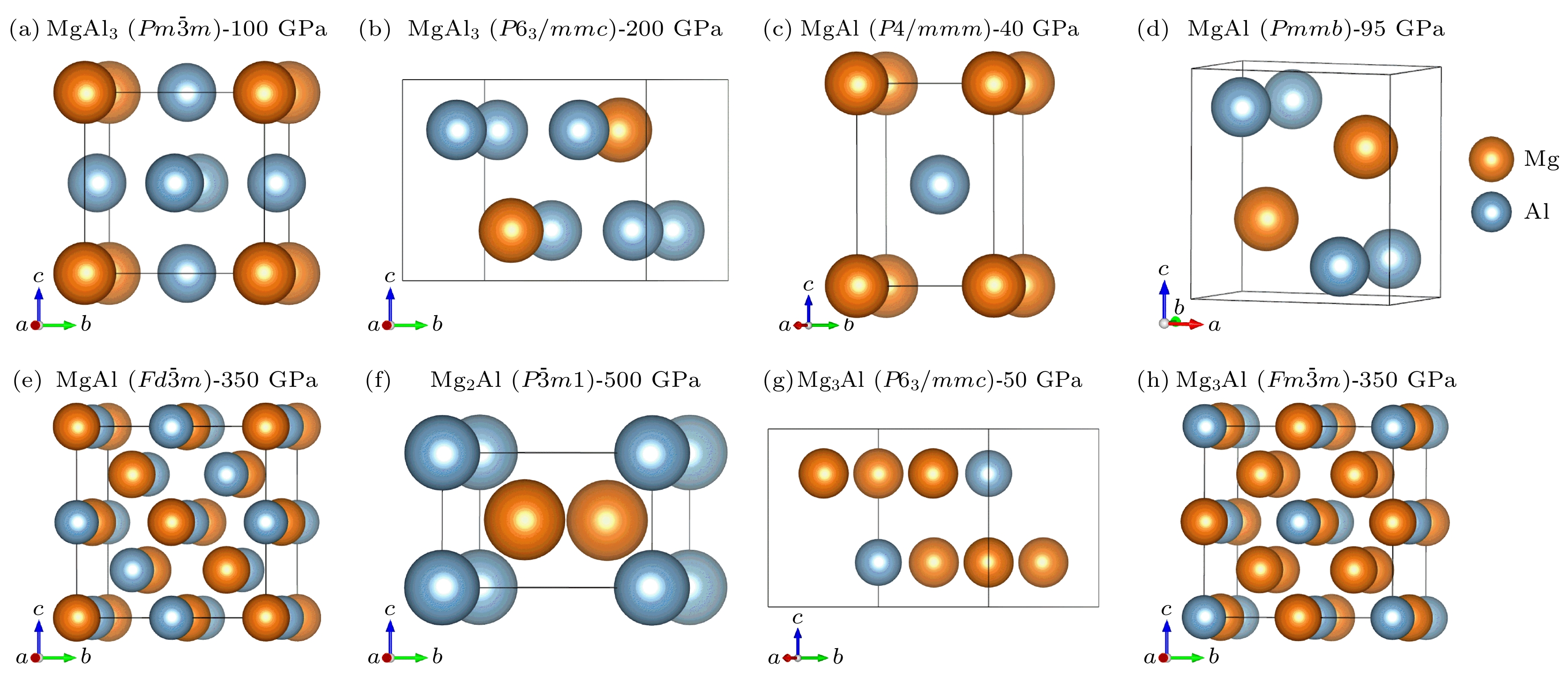 图 4 稳定MgmAln化合物的晶体结构图(橙色和蓝色球分别代表Mg原子和Al原子) (a) MgAl3-Pm-3m在100 GPa的结构; (b) MgAl3-P63/mmc在200 GPa的结构; (c) MgAl-P4/mmm在40 GPa的结构; (d) MgAl-Pmmb在95 GPa的结构; (e) MgAl-Fd-3m在350 GPa的结构; (f) Mg2Al-P-3m1在500 GPa的结构; (g) Mg3Al-P63/mmc在50 GPa的结构; (h) Mg3Al-Fm-3m在350 GPa的结构