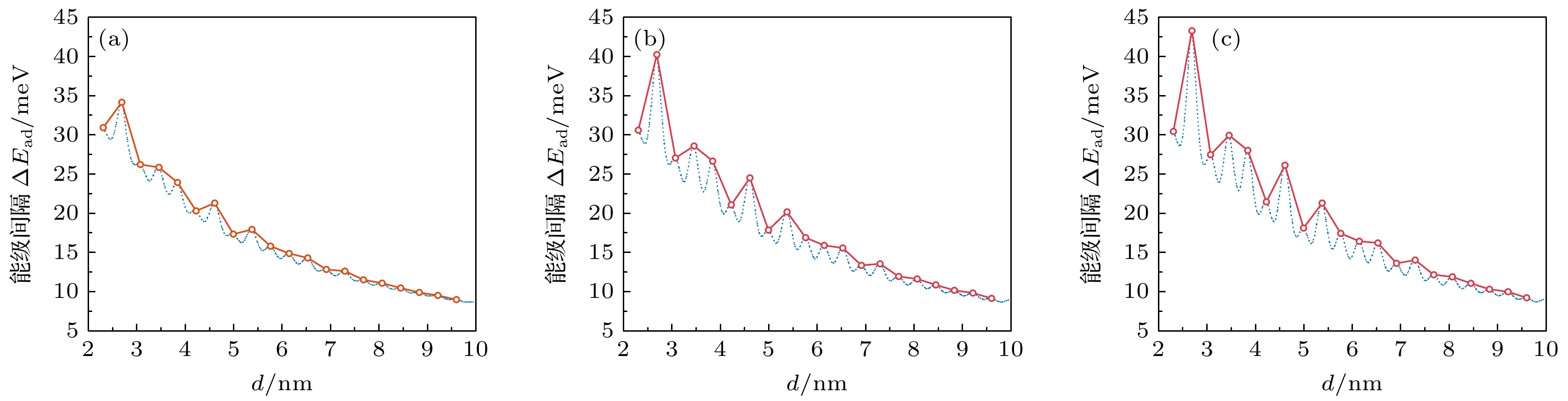 Figure 10. Dependence of electron addition energy level spacing $\varDelta {E_{{\text{ad}}}}$(corresponding to conductance sub-peak spacing) spacing on nearest-neighbor dopant-induced separation d: (a) NNH model; (b) NNNH model; (c) LRH model.