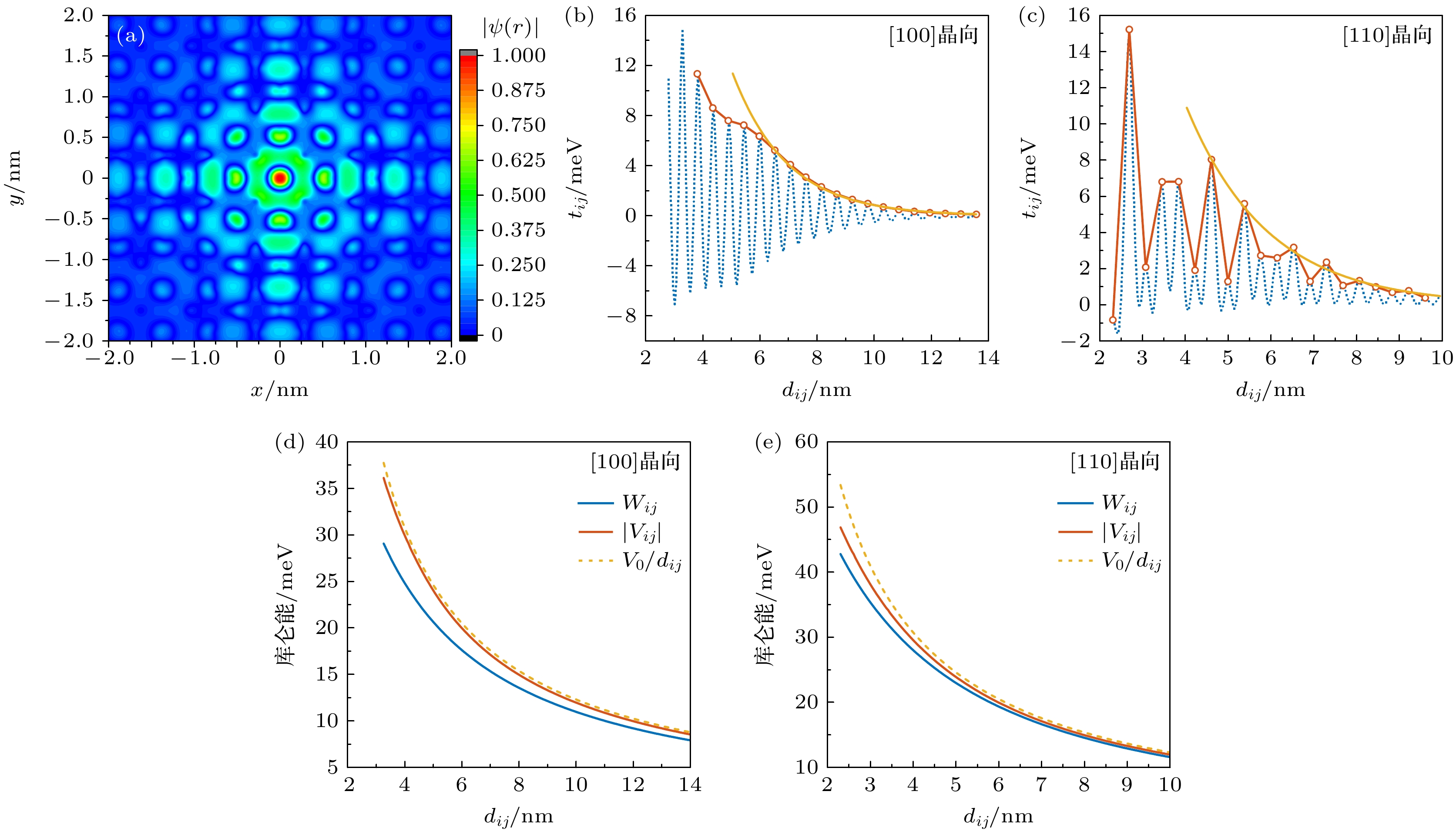 Figure 3. (a) The ground state 1sA1 multi-valley coupled wavefunction of the electron bound to isolated P donor atoms in silicon; (b) the relationship between the coupling strength tij of dopant atoms arranged along the [100] crystal direction and the distance dij between dopant atoms; (c) the relationship between the coupling strength tij of dopant atoms arranged along the [110] crystal direction and the distance dij between dopant atoms; (d) the relationship between the long-range Coulomb attraction energy Vij, the inter-site electron repulsion energy Wij and the distance dij between impurity atoms arranged along the [100] crystal direction; (e) the relationship between the long-range Coulomb attraction energy Vij, the inter-site electron repulsion energy Wij and the distance dij between impurity atoms arranged along the [110] crystal direction.