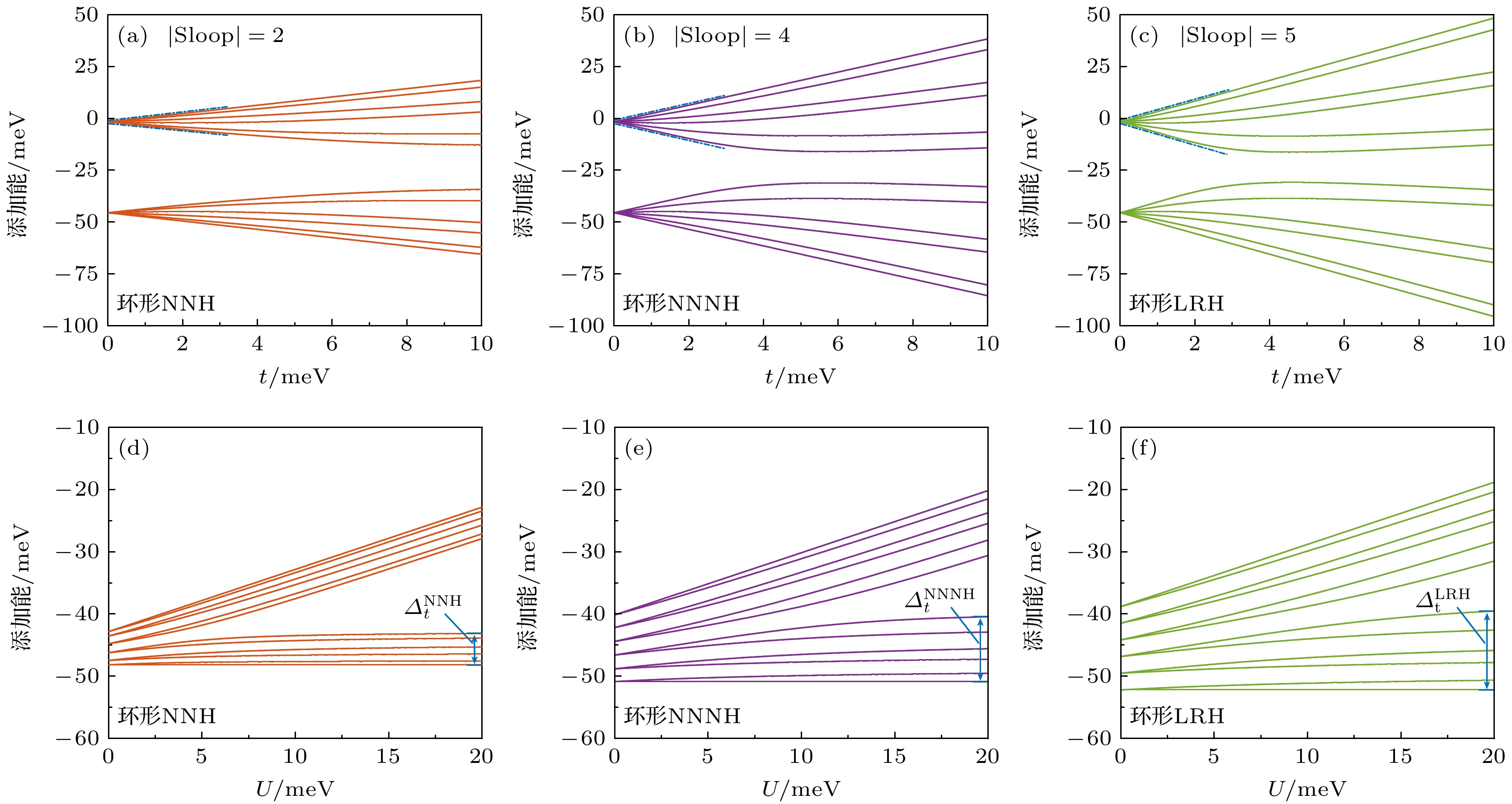 图 4 环形阵列($N = 6$)的电子添加能, 红色为NNH模型、紫色为NNNH模型、绿色为LRH模型 (a)—(c) 耦合强度对阵列电子添加能的影响($U = 43.86\ {\text{meV}}$); (d)—(f) 位间电子排斥能对于阵列电子添加能的影响($t = 1.34\ {\text{meV}}$)