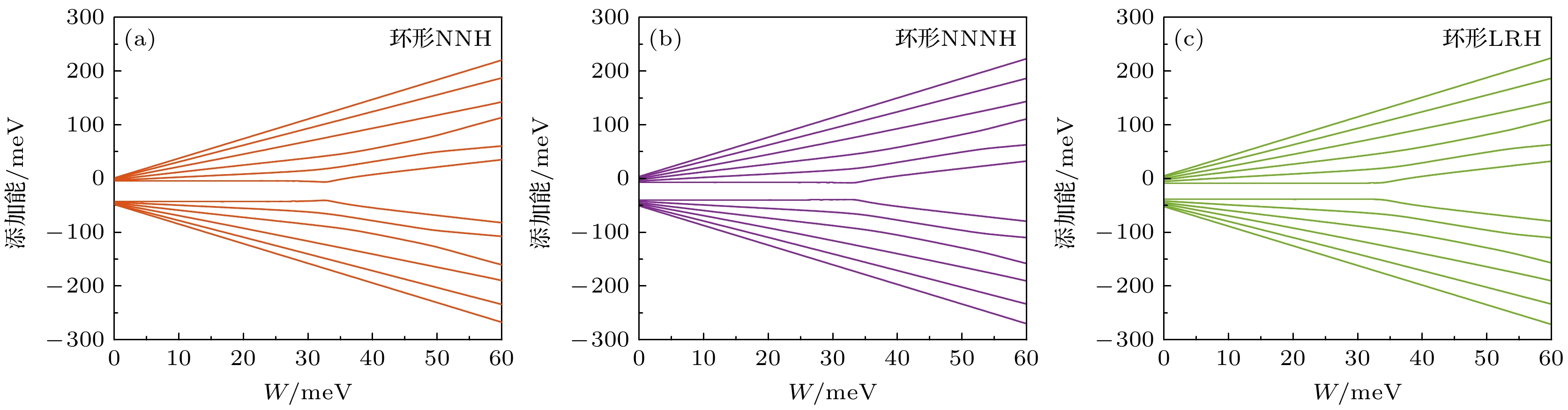 图 10 电子添加能能级间距(电导子峰间距)$\varDelta {E_{{\text{ad}}}}$随最近邻杂质原子间距d的变化关系 (a) NNH模型; (b) NNNH模型; (c) LRH模型