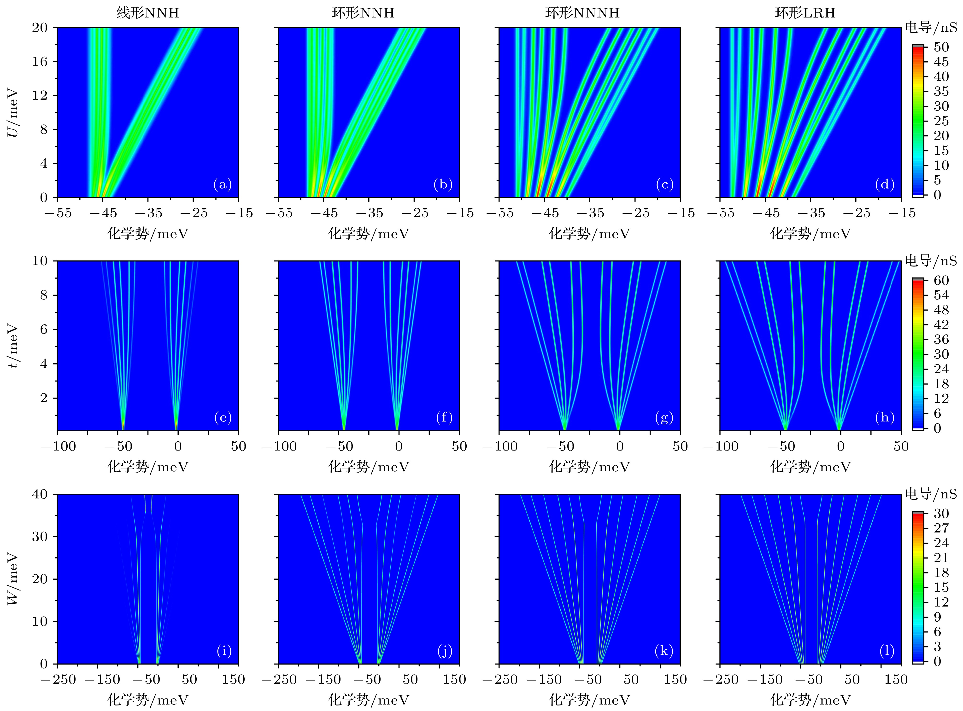 图 8 杂质原子阵列的电导特性对能量参数的响应规律 (a)—(d) 耦合强度t对电导特性的影响; (e)—(h) 在位电子排斥能U对电导特性的影响; (i)—(l) 最近邻位间电子排斥能W对电导特性的影响; (a), (e), (i) 仅存在最近邻跃迁的一维阵列; (b), (f), (j) NNH环形阵列; (c), (g), (k) NNNH环形阵列; (d), (h), (l) LRH环形阵列