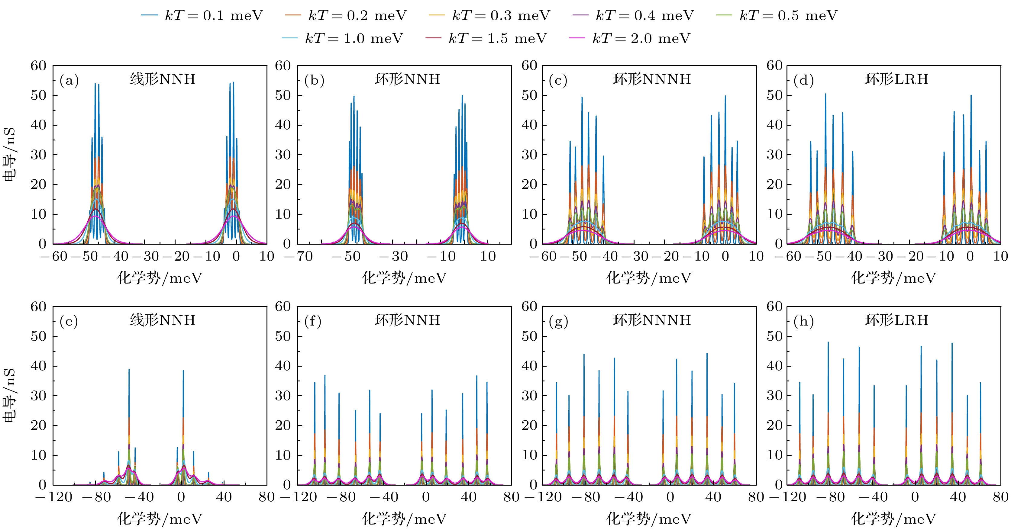 Figure 9. Temperature-dependent conductance characteristics of the dopant-atom arrays: (a)–(d) Systems without inter-site repulsion Wij and long-range attraction Vij; (e)–(h) systems with inter-site repulsion Wij and long-range attraction Vij; (a), (e) An 1D dopant-atom array with only nearest-neighbor hopping electrons; (b), (f) NNH annular array; (c), (g) NNNH annular array; (d), (h) LRH annular array.