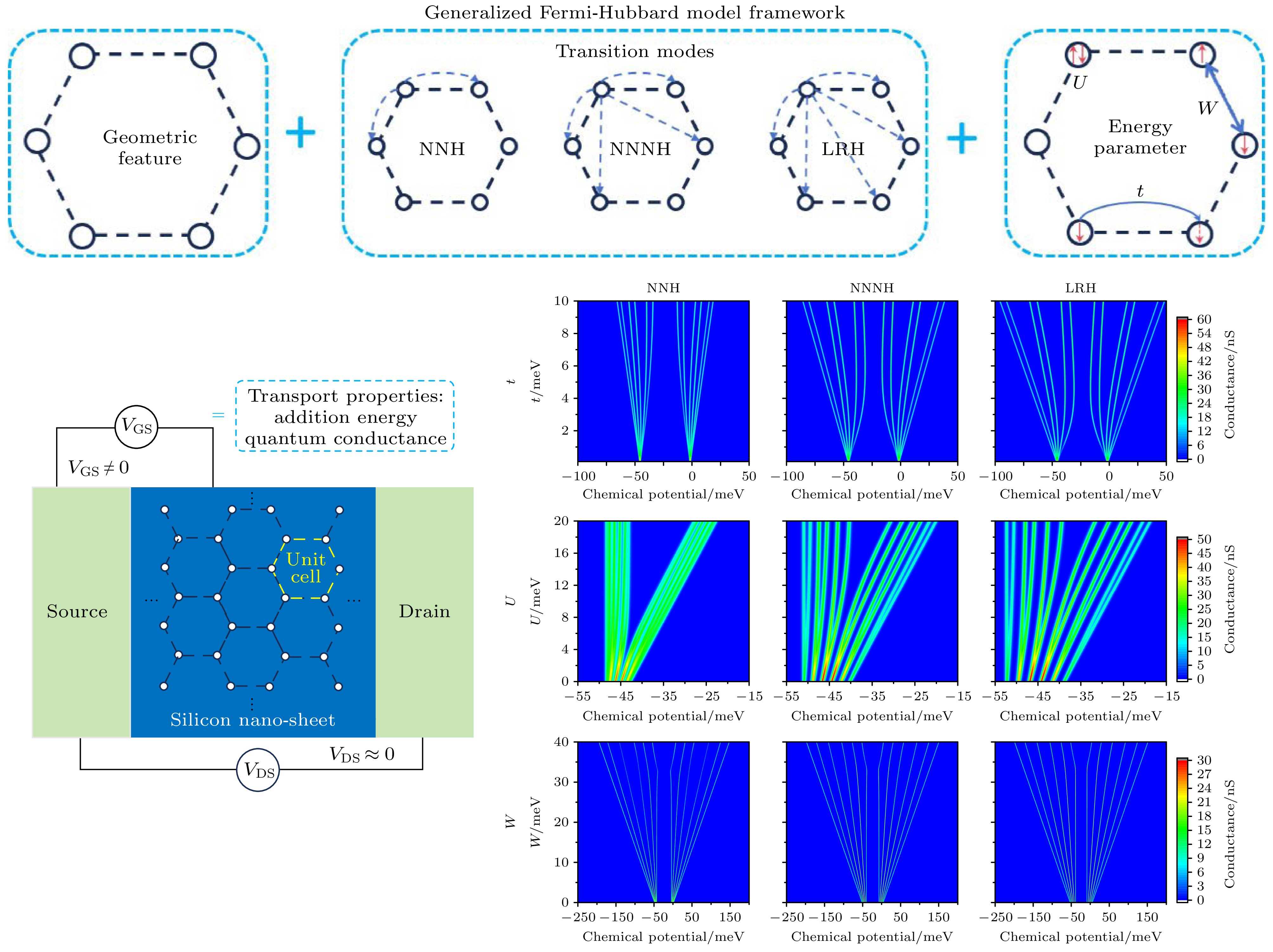 Dopant-induced quantum dot arrays in silicon-based nanostructures have received much attention due to their great potential applications in fields such as quantum computing and quantum simulation. When quantum dots are arranged in different geometric configurations such as linear, annular, or grid shapes, the differences in their inherent topological properties will lead to significantly different spatial distributions of the Coulomb interaction potential. The potential field distribution directly affects the phase coherence of electron wavefunctions, thereby regulating the dynamic behaviors of electrons such as electron tunneling and hopping between quantum dots, and greatly influencing the electron transport properties in the system. Our study aims to establish a basic theoretical framework to clarify the regulation mechanism of quantum dot geometric configurations on electron hopping transport. Therefore, we construct a generalized Fermi-Hubbard model for silicon-based dopant-induced quantum dot arrays. The model defines the distance between quantum dots through an effective Euclidean distance matrix ( D ), which uniquely determines the geometric shape of the array, and defines the allowed electron hopping modes through an adjacency matrix ( A ). Using the framework and exact diagonalization method, we perform detailed numerical simulations on the electron transport properties in the traditional unit cell of two-dimensional ordered distribution dopant-induced quantum dot arrays. Generally, the primitive unit of a two-dimensional orderly distributed dopant-induced quantum dot array is a regular polygon that satisfies specific translational and rotational symmetries. We thereby refer to the quantum dot arrays distributed according to regular polygons as annular arrays. The geometric features of annular quantum dot arrays and the electron hopping modes including nearest-neighbor hopping (NNH), next-nearest-neighbor hopping (NNNH) and long-range hopping (LRH), exhibit significant regulation of the electron addition energy and quantum conductance. The regulation arises from interactions of key energy parameters, including coupling strength (t), on-site Coulomb repulsion (U) and inter-site Coulomb repulsion (W). In the electron addition energy spectrum, such a regulation is manifested in two aspects: energy band broadening and Coulomb gap size. Band broadening is co-regulated by t and W. Under weak coupling conditions, the broadening Δt induced by coupling strength is proportional to t, with its proportional coefficient increasing with the number of hopping paths (LRH > NNNH > NNH). The broadening ΔW caused by inter-site Coulomb repulsion is proportional to W, with the proportional coefficient being β, which is a geometry-dependent correlation broadening coefficient. In multi-site annular arrays, β exhibits a logarithmic relationship with the site number N. The size of Coulomb gap is co-influenced by U, t and W. The competition between U and W determines the electron configuration mode (dominated by single-electron occupation of sites or double-electrons occupation of spaced sites), with a critical value α for electron configuration reconstruction that causes a change in electron configuration across the threshold. When U/W > α, single-electron occupation dominates, and the gap is determined by the competition between U and t; when U/W < α, double-electrons occupation dominates, the gap expands under the influence of W, accompanied by the formation of sub-bands. In the quantum conductance spectrum, regulation is reflected by the distribution of conductance peak intensity. Geometric configurations significantly affect peak intensity distribution. Linear arrays exhibit concentrated peak intensities due to edge states formed by open boundaries, while annular arrays with periodic boundaries and no edge states show more uniform peak distributions. Additionally, in annular arrays, the electron transport direction is non-collinear with the inter-site repulsion direction, endowing them with stronger robustness against transport inhibition induced by W. The influence of hopping modes is twofold. More hopping paths (LRH > NNNH > NNH) result in more non-zero hopping matrix elements, which causes higher average conductance. Meanwhile, hopping paths affect the phase coherence of wavefunctions, modulating the intensity of individual conductance peaks and forming distinct distribution. In conclusion, we establish a theoretical framework to clarify the physical mechanism, in which the geometric configurations and electron hopping modes of silicon-based dopant-induced quantum dot arrays regulate electron transport properties through synergistic interactions with key energy parameters (t, U, W). Electron addition energy spectra and quantum conductance spectra reveal the regulatory rules of these factors on electron transport behaviors, providing a theoretical guidance for optimally designing silicon-based quantum devices. -