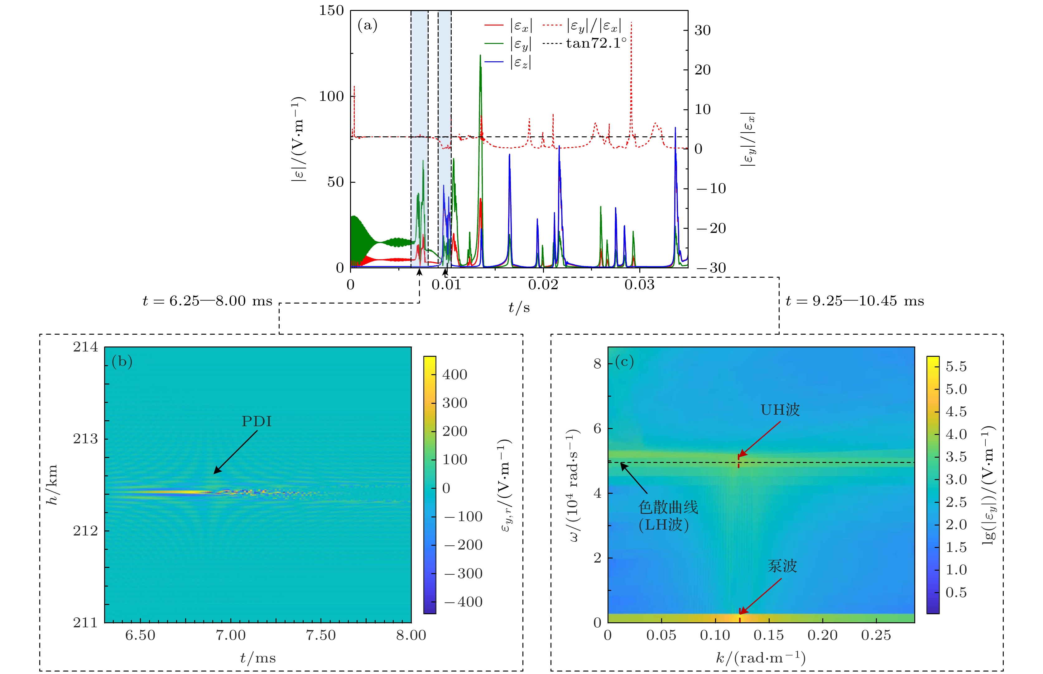 Figure 6. Evolutions of plasma parametric instabilities: (a) Temporal evolutions of the electric field intensity in the x, y and z directions at a height of h = 212 km; (b) two-dimensional contour of the spatiotemporal evolution of the real part of the slow-varying amplitude of the electric field in the y direction (εy, r) during t = 6.25—8.00 ms; (c) two-dimensional Fourier transform of the electric field intensity in the y direction during t = 9.25—10.45 ms.