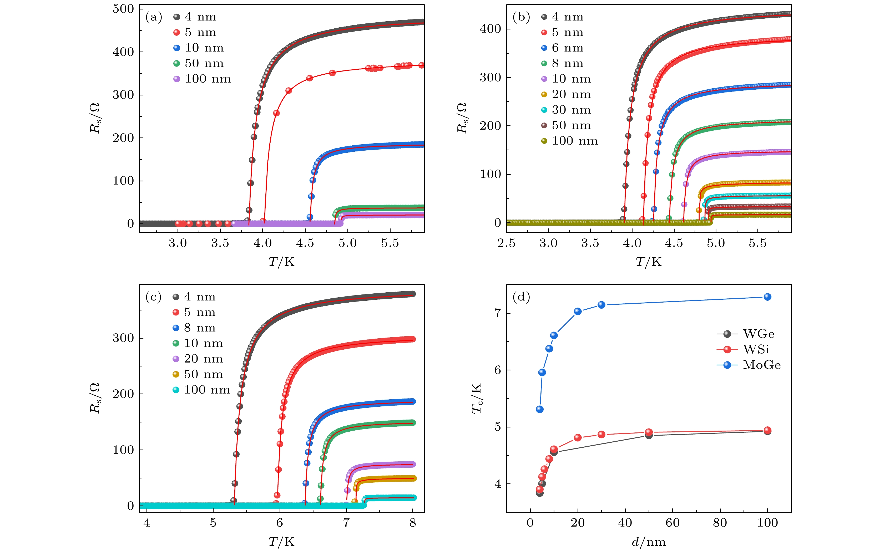 图 1 零磁场下非晶薄膜WGe (a), WSi (b), MoGe (c)超导转变的厚度依赖关系; (d) WGe, WSi和MoGe薄膜的临界温度的厚度依赖性
